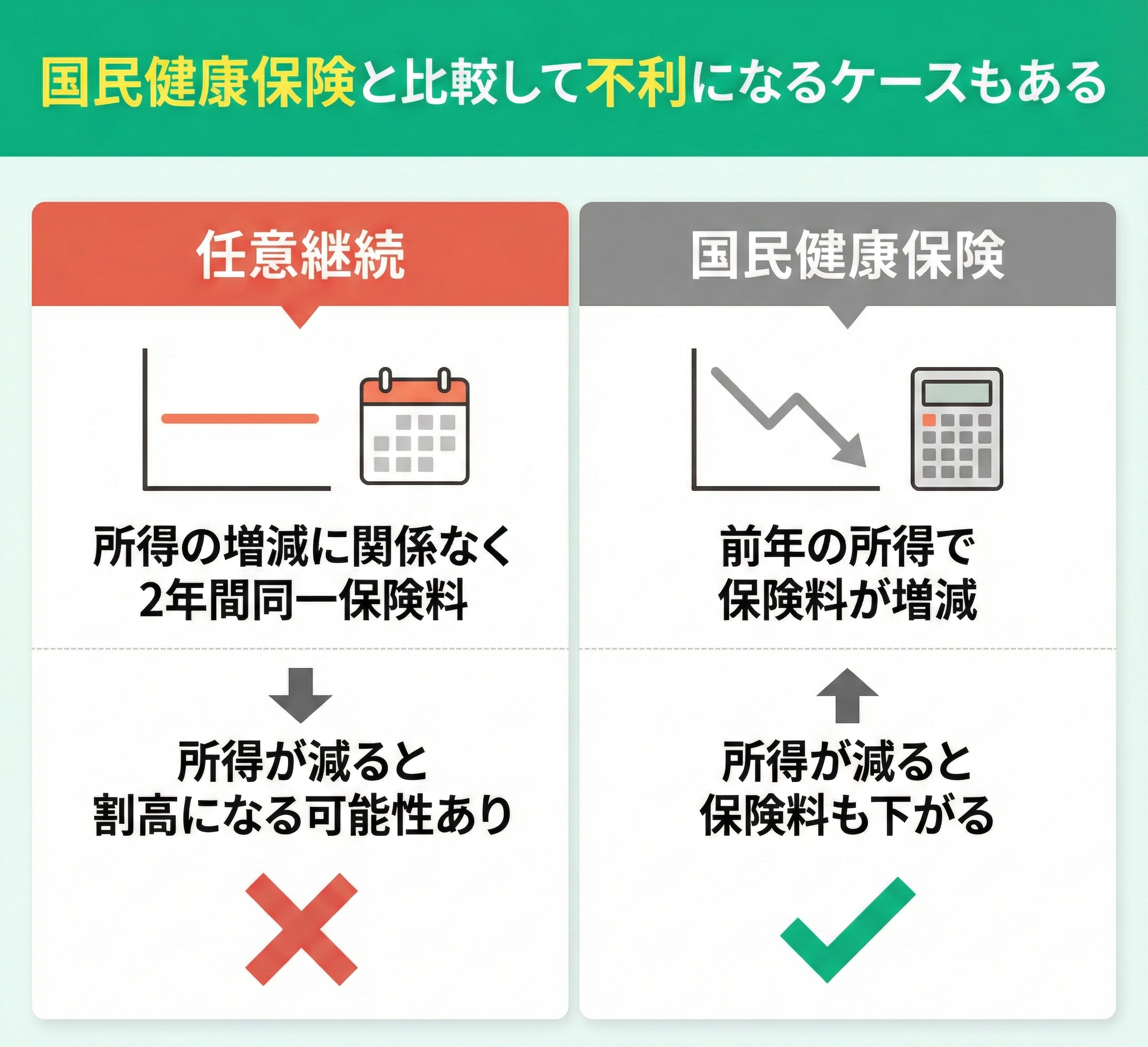 2つめは、国民健康保険と比較して不利になるケースがあることです。