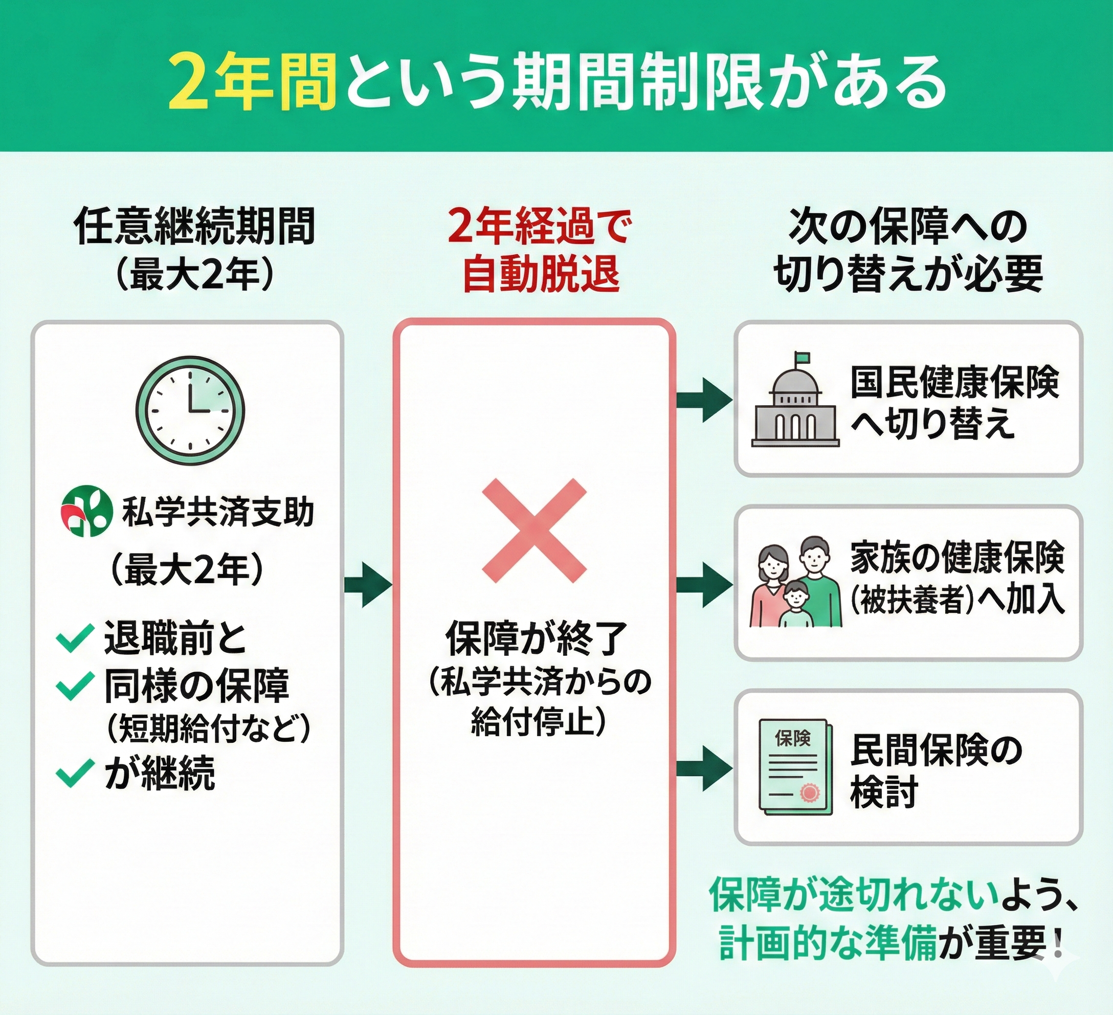 任意継続することで退職前と同様の保障を私学共済から受けられますが、2年経過すると自動的に脱退になります。