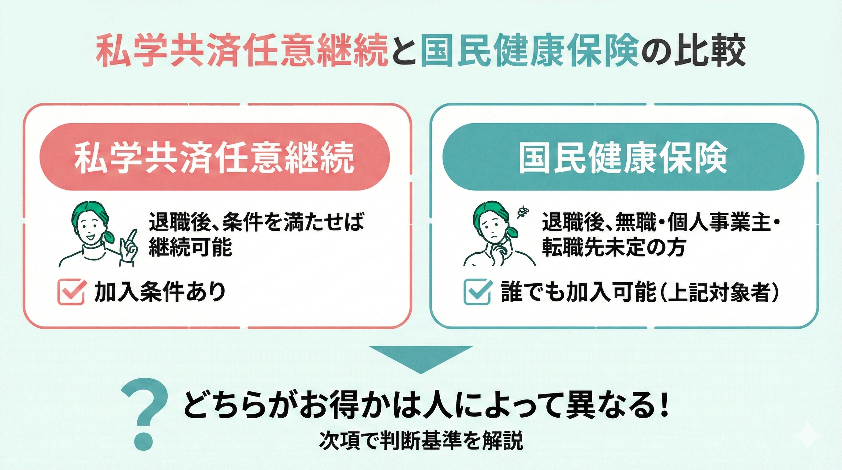 ここからは、私学共済の任意継続と国民健康保険の比較を解説します。