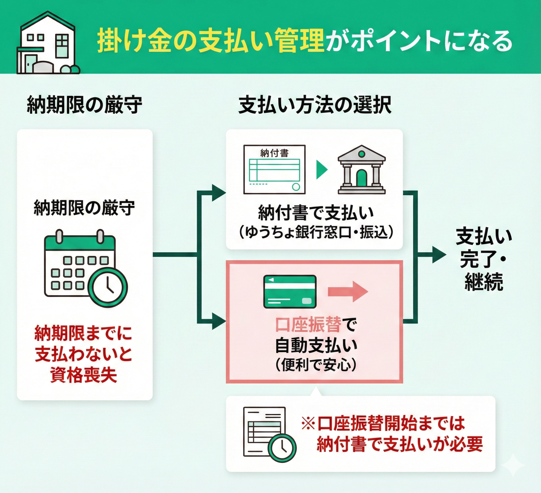 納期限までに払い込みをしないと任意継続加入者資格を喪失するため、不安であれば自動的に支払われる口座振替が便利です。