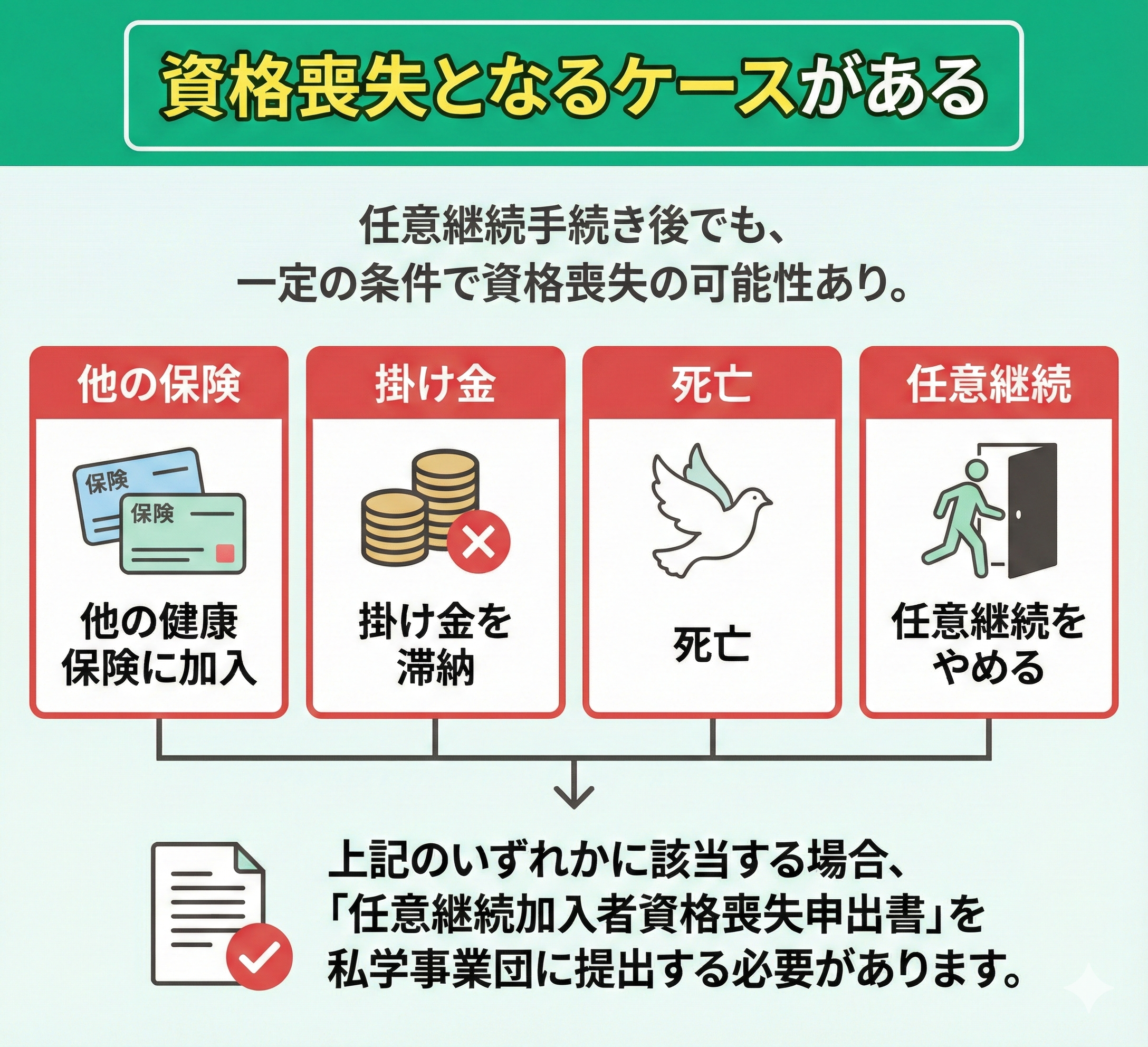任意継続の手続きを終えたあとでも、一定の条件を満たすと資格喪失になる可能性があるため注意が必要です。