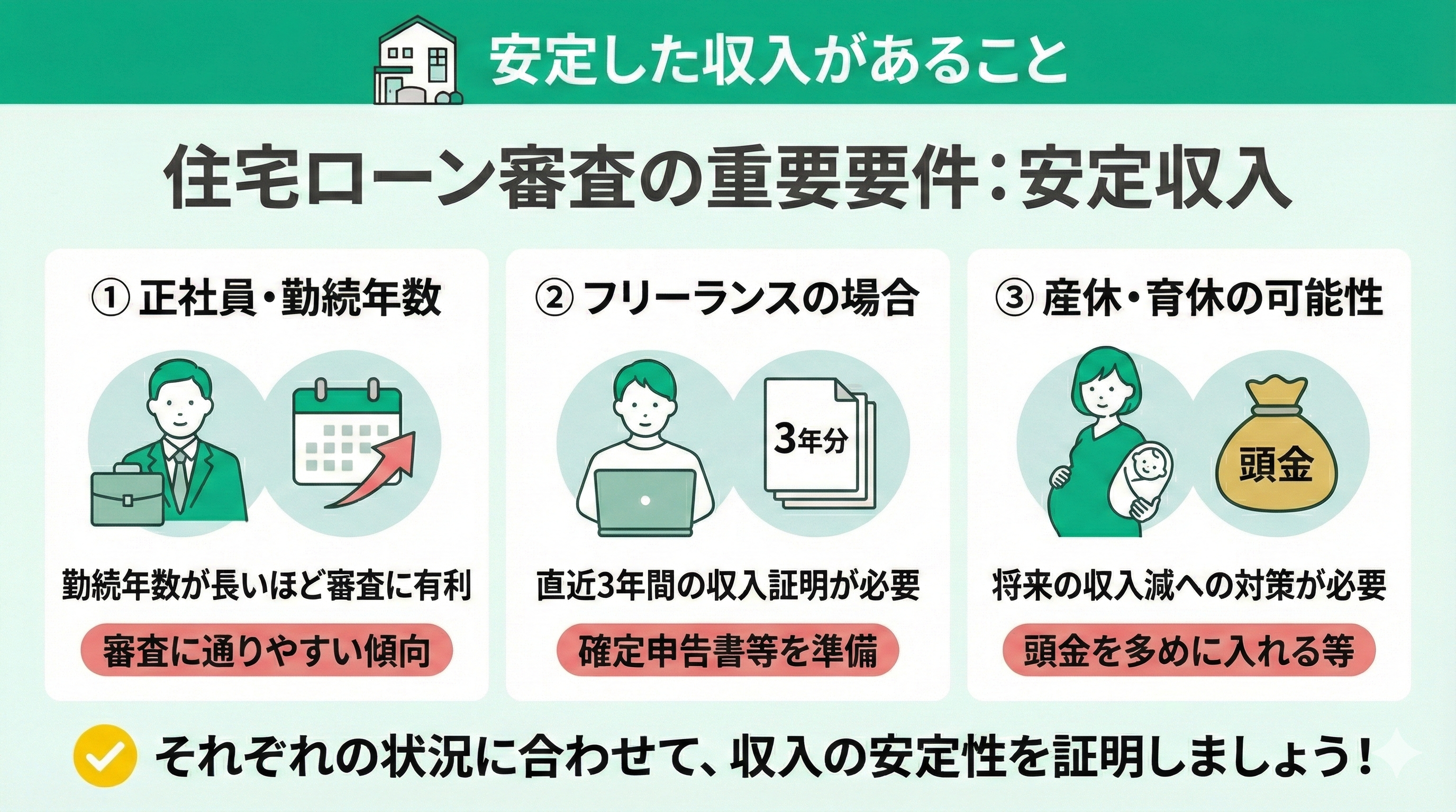 住宅ローンの審査に通るには、安定した収入が必要です。