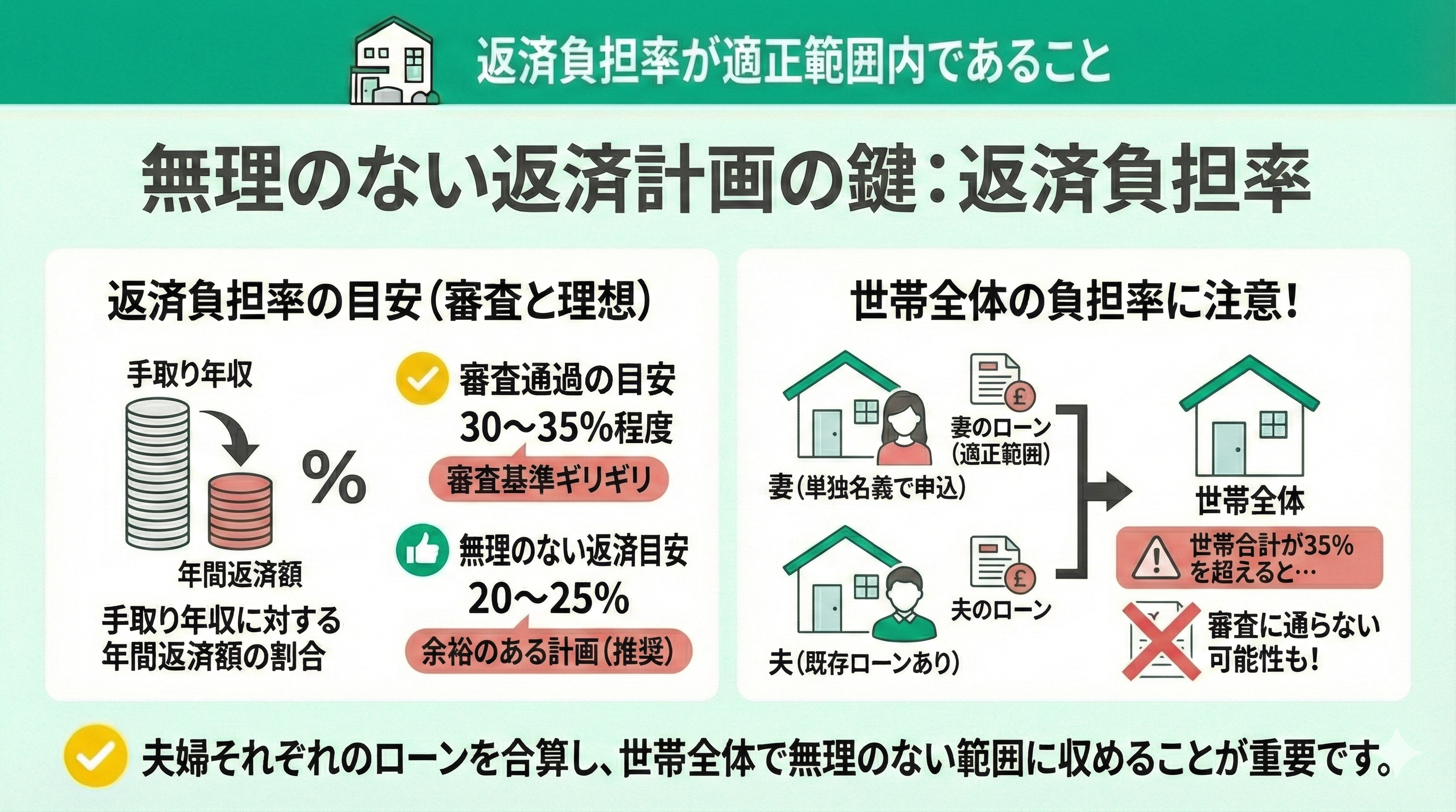 妻の収入に対して返済負担率が適正であっても、夫が契約している住宅ローンと合わせて世帯全体の返済負担率が35%を超えると、妻の単独名義でも審査に通らない可能性があります。