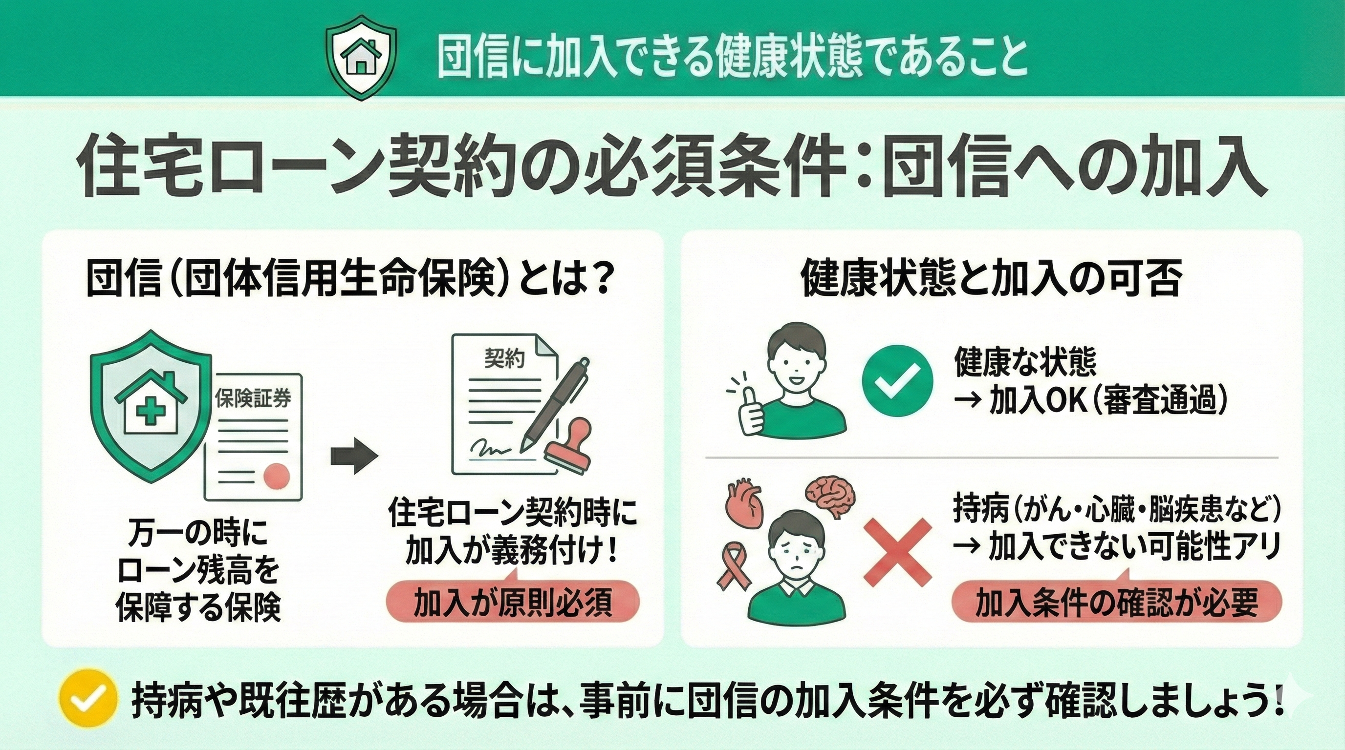 がんや心臓疾患、脳の疾患など持病があると団信に加入できない可能性があります。何らかの疾患を抱えている場合には、団信の加入条件を確認してみてください。