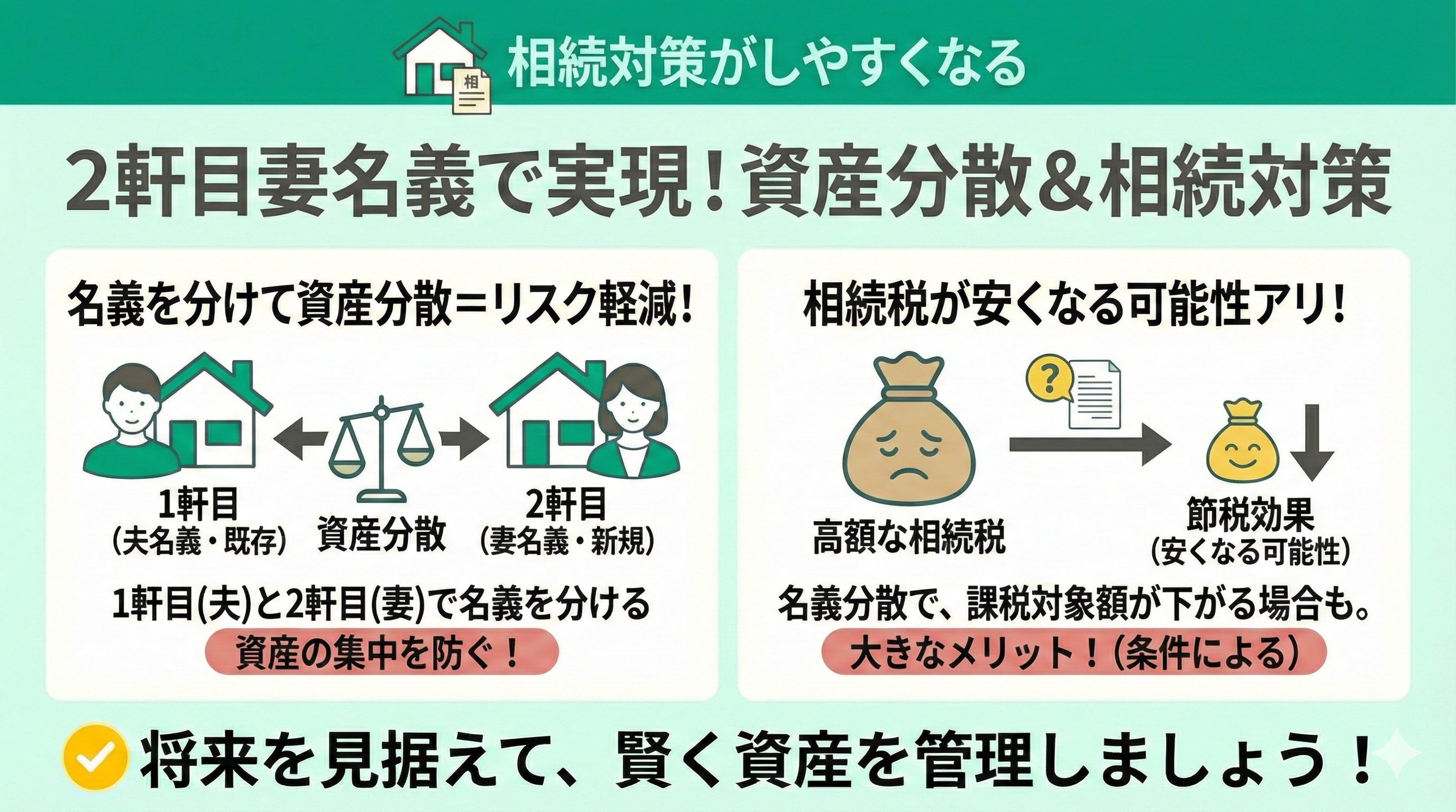 1軒目の住宅を夫がすでに所有しているため、2軒目は妻名義にすることで資産分散ができ、相続対策がしやすくなります。