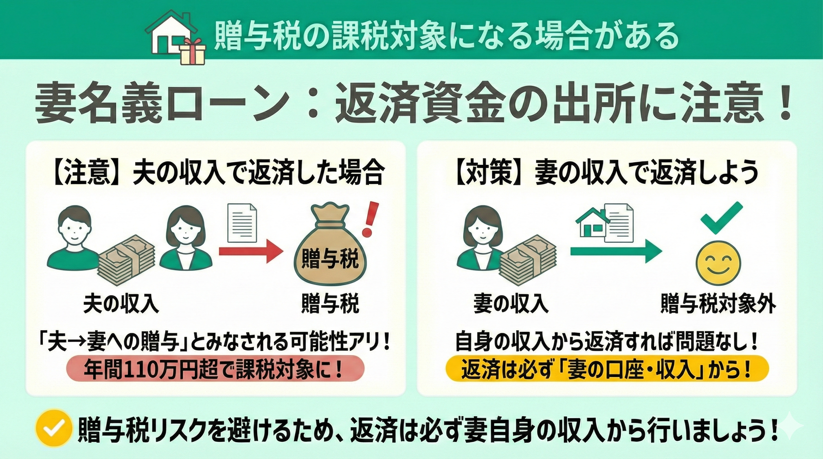 年間110万円以上の贈与には贈与税がかかるため、返済には妻の収入を充てるようにしてください。