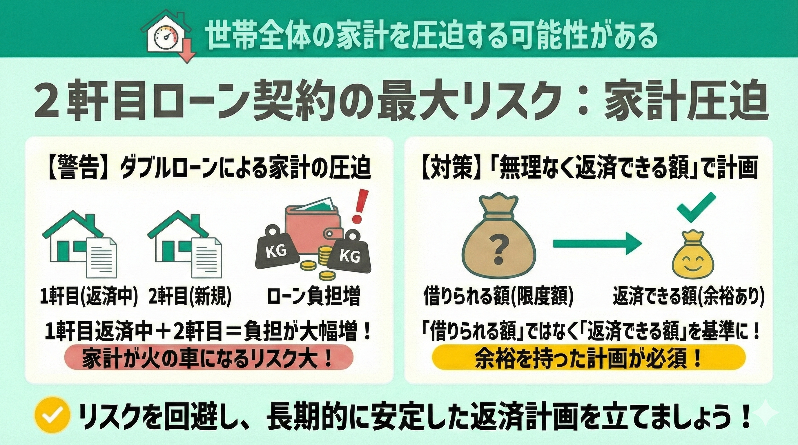 妻名義での2軒目購入は、審査基準が厳しく返済負担も大きくなりがちです。家計の破綻を防ぐためには、目先の返済だけでなく、将来のライフイベントを見据えた資金計画が欠かせません。