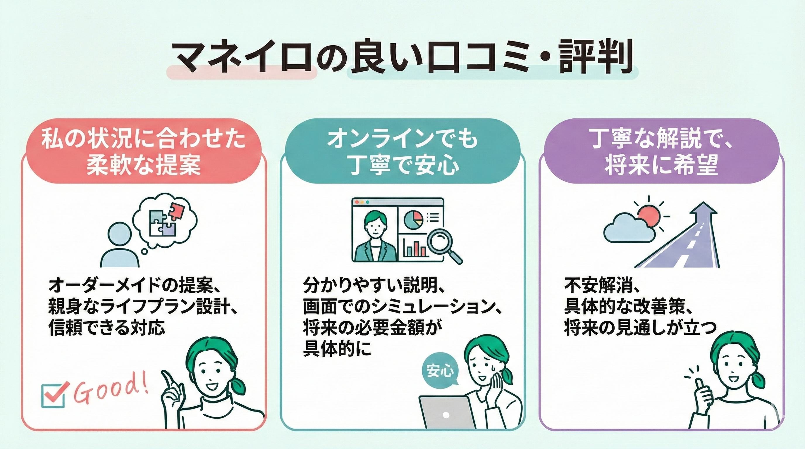 実際の評判を見ても、「しつこい勧誘はなかった」という声が多く、マネイロはあくまで「利用者の納得」を重視して運営されている、安心して相談できるサービスと言えます。