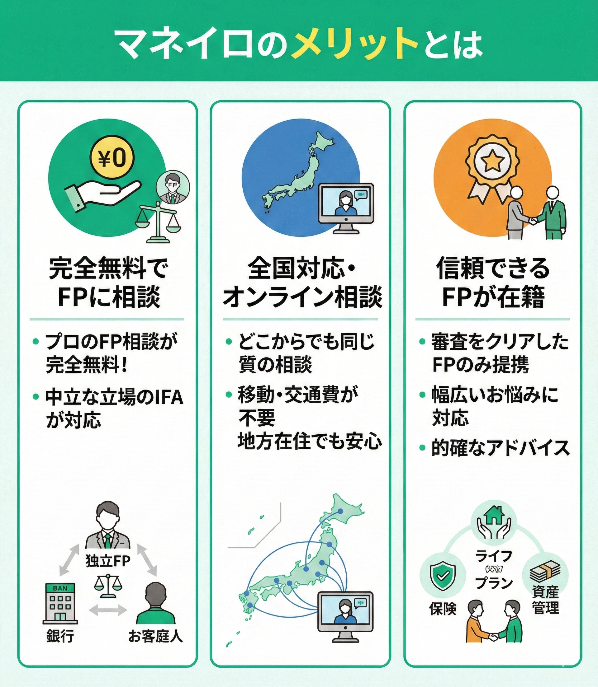 マネイロに在籍しているマネイロコンシェルは、金融機関に属さない独立したアドバイザー(IFA)で、中立の立場で解決策の案内ができます。