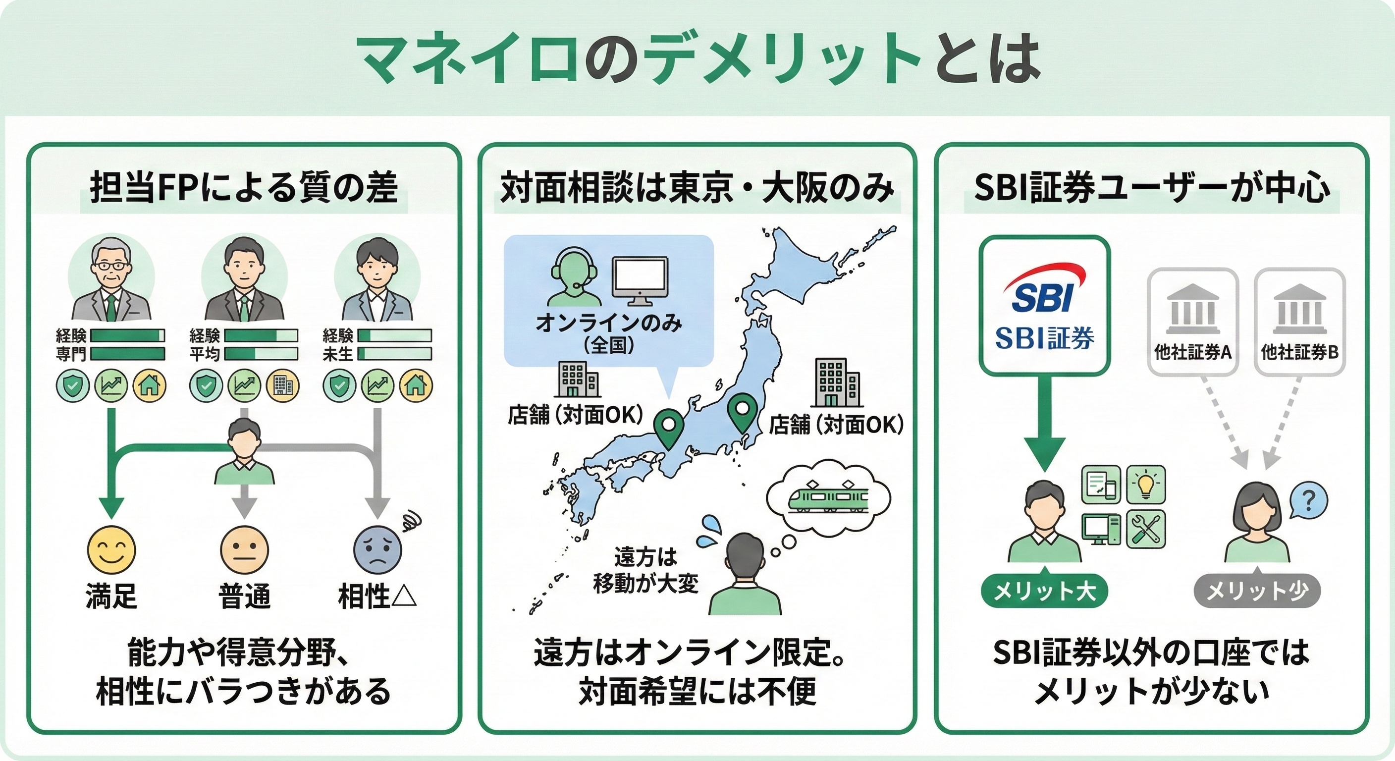 マネイロのFPは一定の審査基準をクリアしていますが、担当者によって対応力や提案力に差が出る可能性があります。