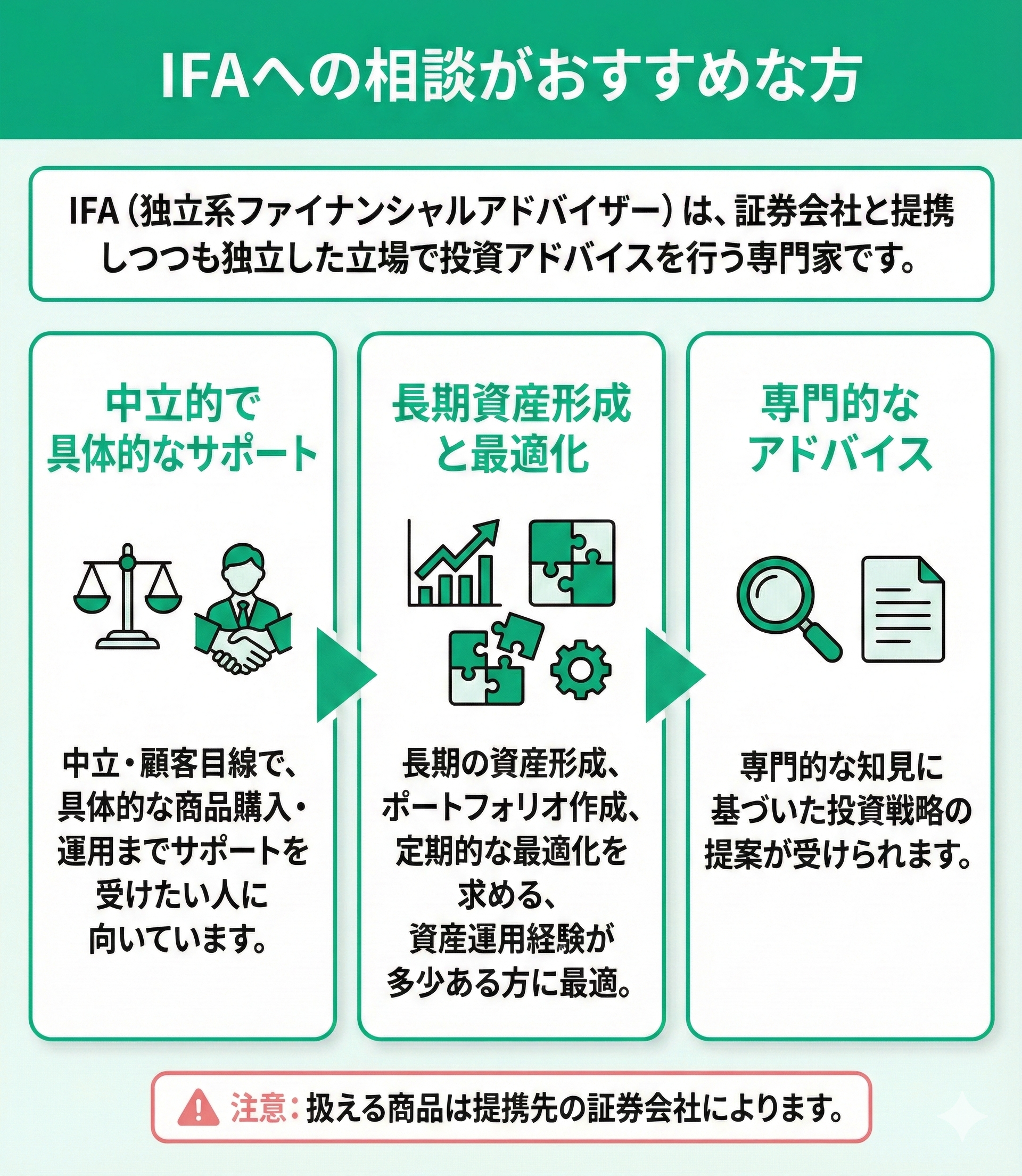 ただし、IFAの扱える商品は提携先の証券会社によるため、注意しましょう。