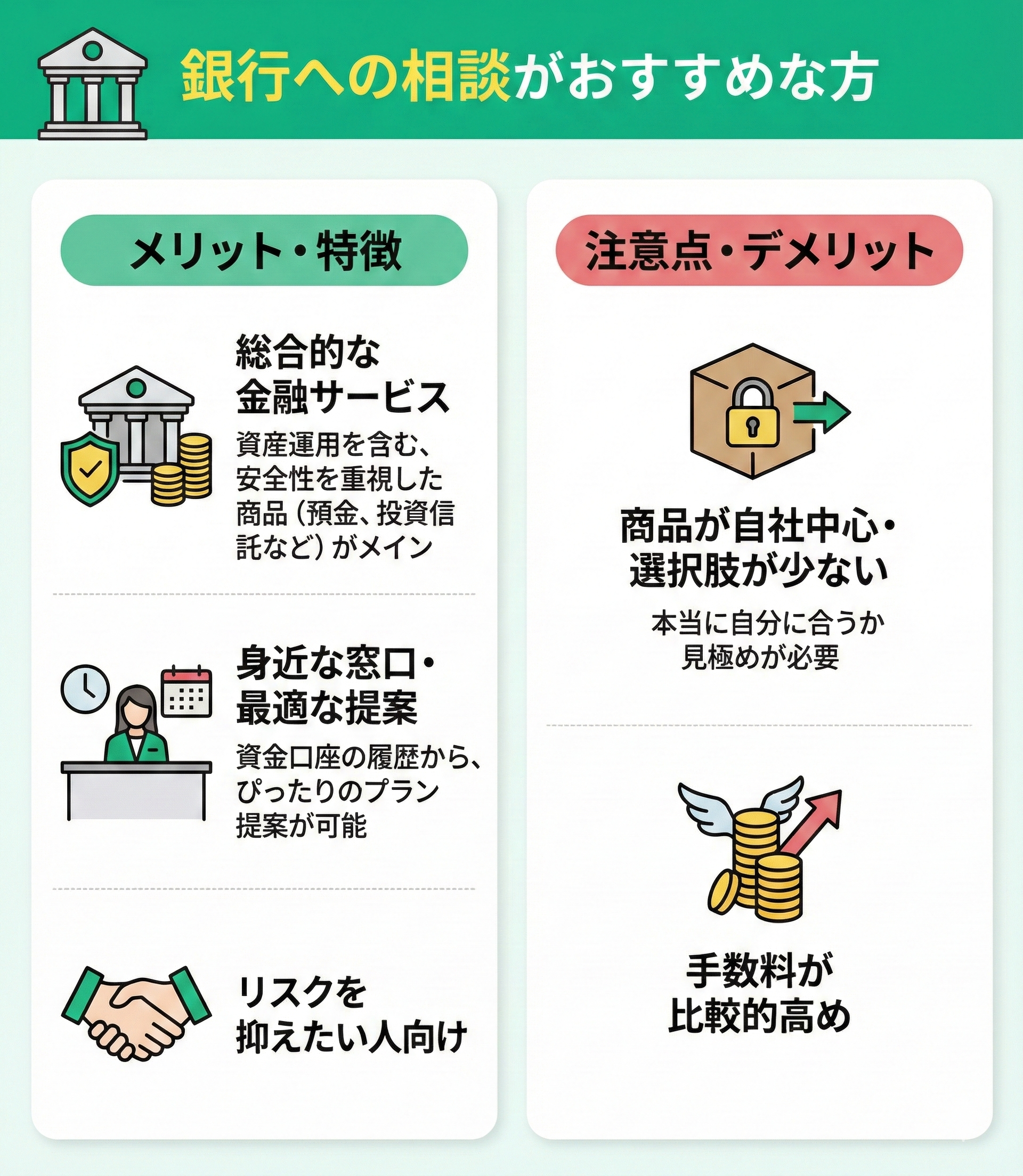 積極的な資産運用をしたい方や、具体的な運用を検討中の方は、自分にあった商品の選び方や、運用方法について、より専門性があり情報量も多い担当者に相談できる点が有利です。