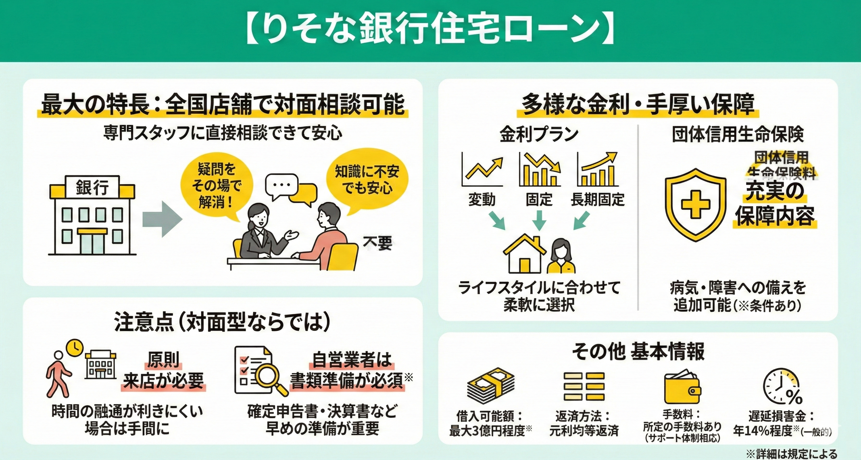 りそな銀行住宅ローンは、全国に店舗を構えており、専門スタッフと直接相談しながら進められる点は、住宅ローンの知識に不安がある方にとって大きな安心材料となります。申し込みから契約までの過程で、疑問や不明点をその場で解消できるため、納得しながら手続きを進めたい方には向いています。