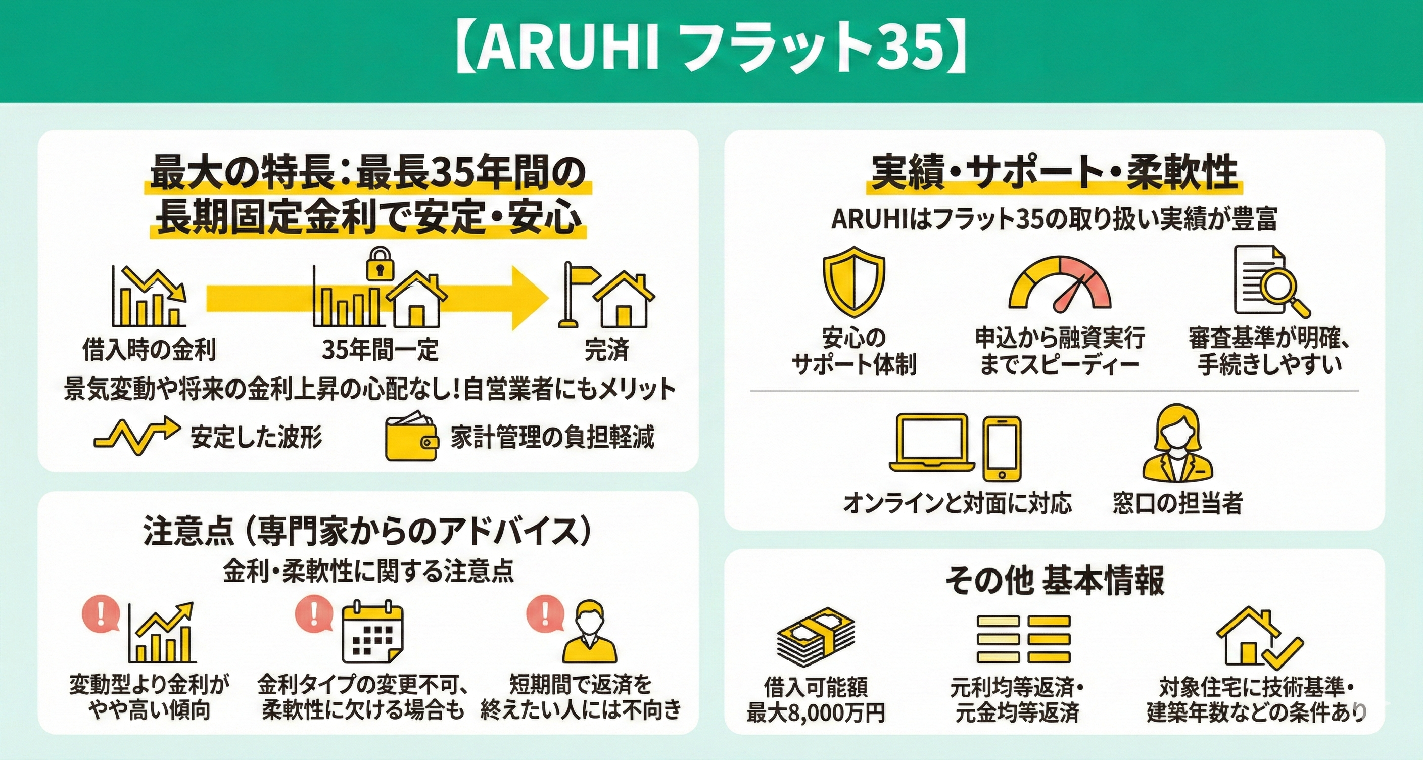 ARUHIが提供する「フラット35」は、最長35年間にわたって金利が一定の長期固定型住宅ローンとして、安定性を重視する借入希望者から好評です。