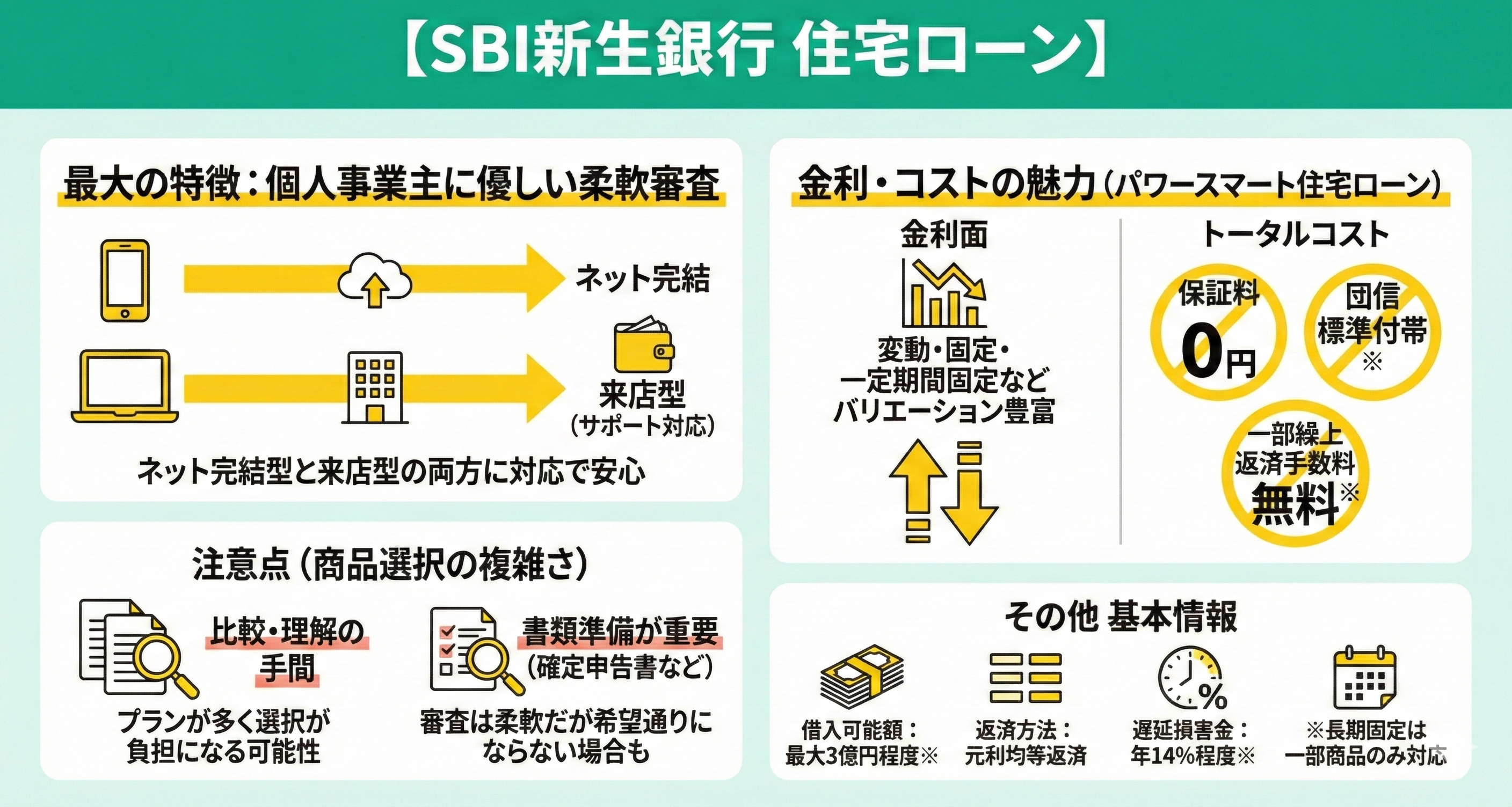 SBI新生銀行の住宅ローンは、個人事業主でも申し込みやすい柔軟な審査体制が整っている点が大きな特徴です。