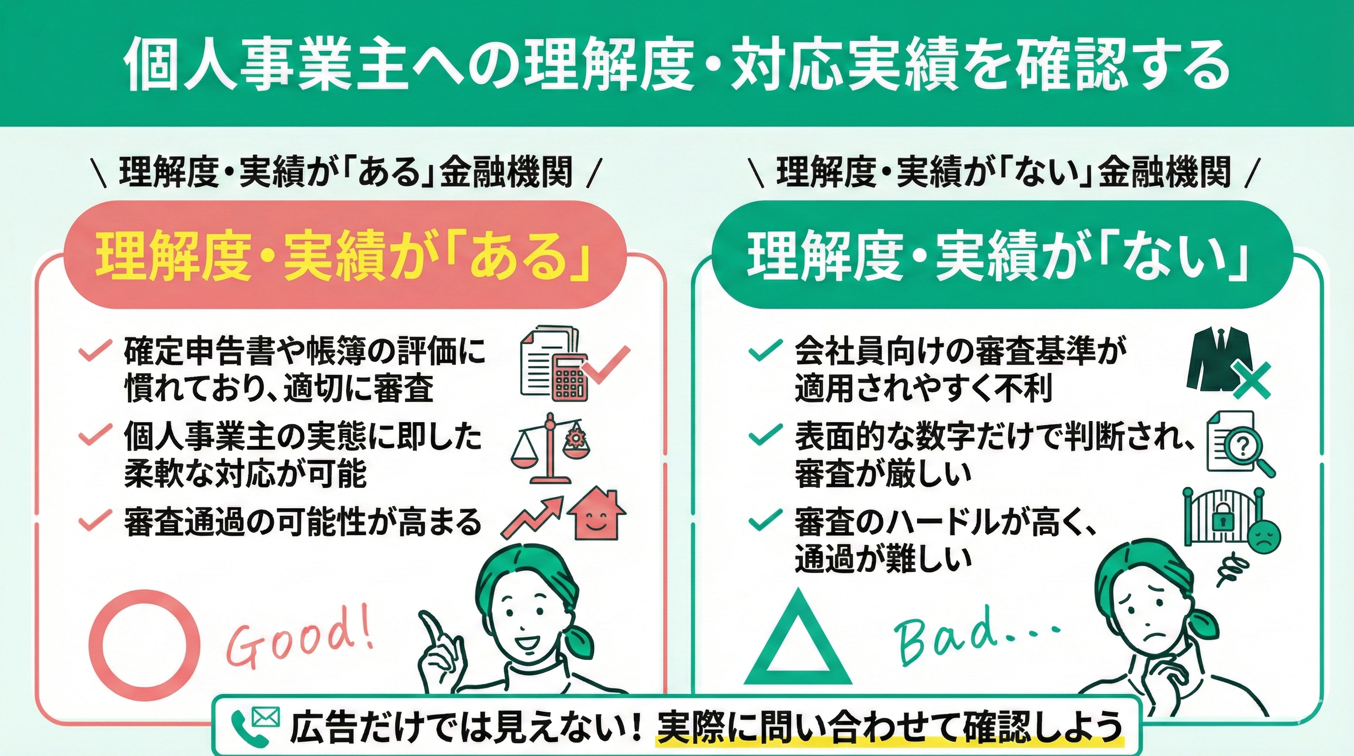 個人事業主が住宅ローンを組む際にまず確認すべきなのが、金融機関の「個人事業主に対する理解度」と「過去の対応実績」です。なぜなら、同じ住宅ローン商品であっても、会社員に比べて個人事業主は審査のハードルが高くなりやすく、その対応姿勢には大きな差があるからです。