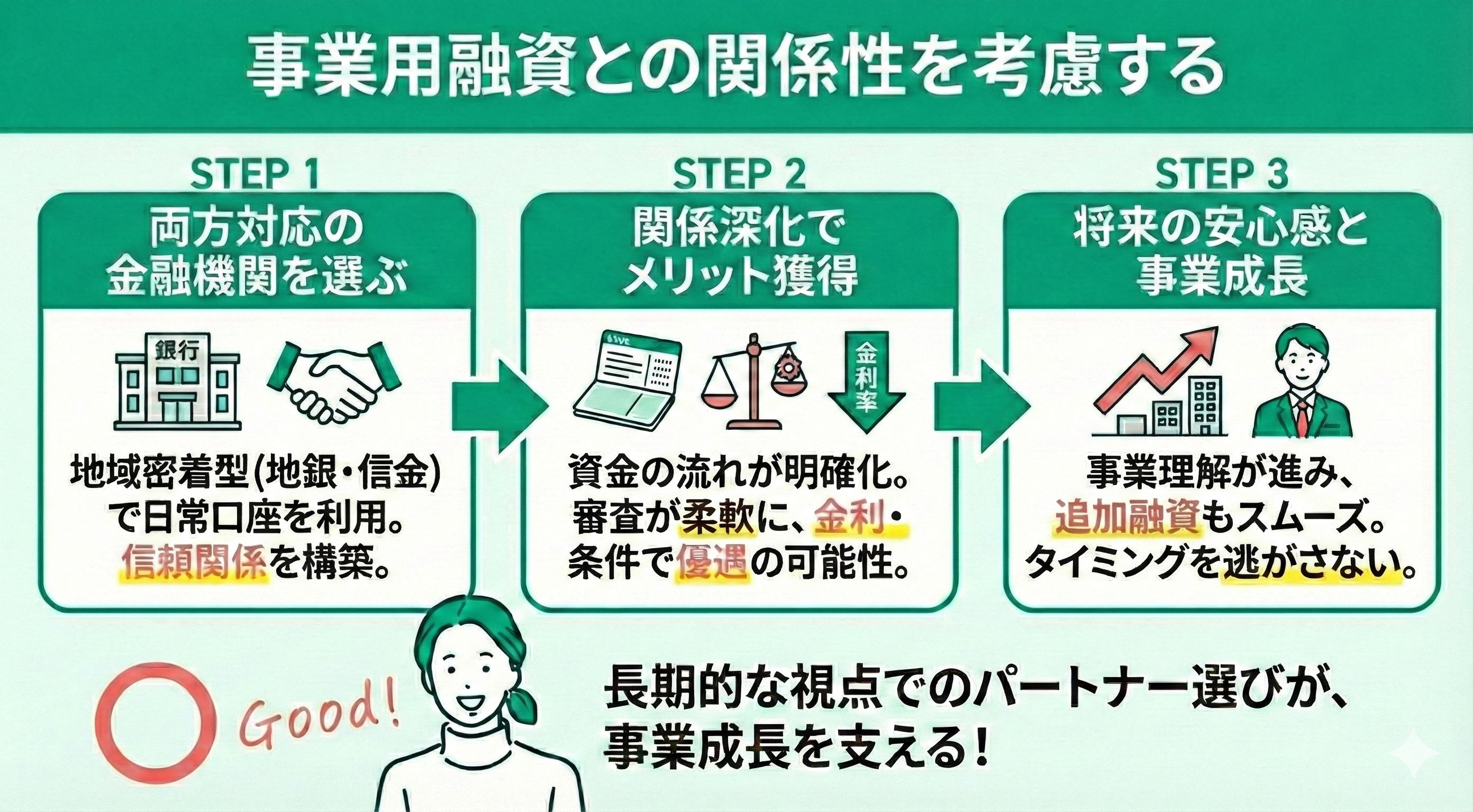 たとえば、地方銀行や信用金庫などの地域密着型の金融機関は、個人と事業の両面で取引実績を積むことで、信頼関係を構築しやすくなります。日常の入出金口座として利用しているだけでも、資金の流れが明確になるため、事業内容の理解が進み、追加融資の相談にも応じやすくなるでしょう。