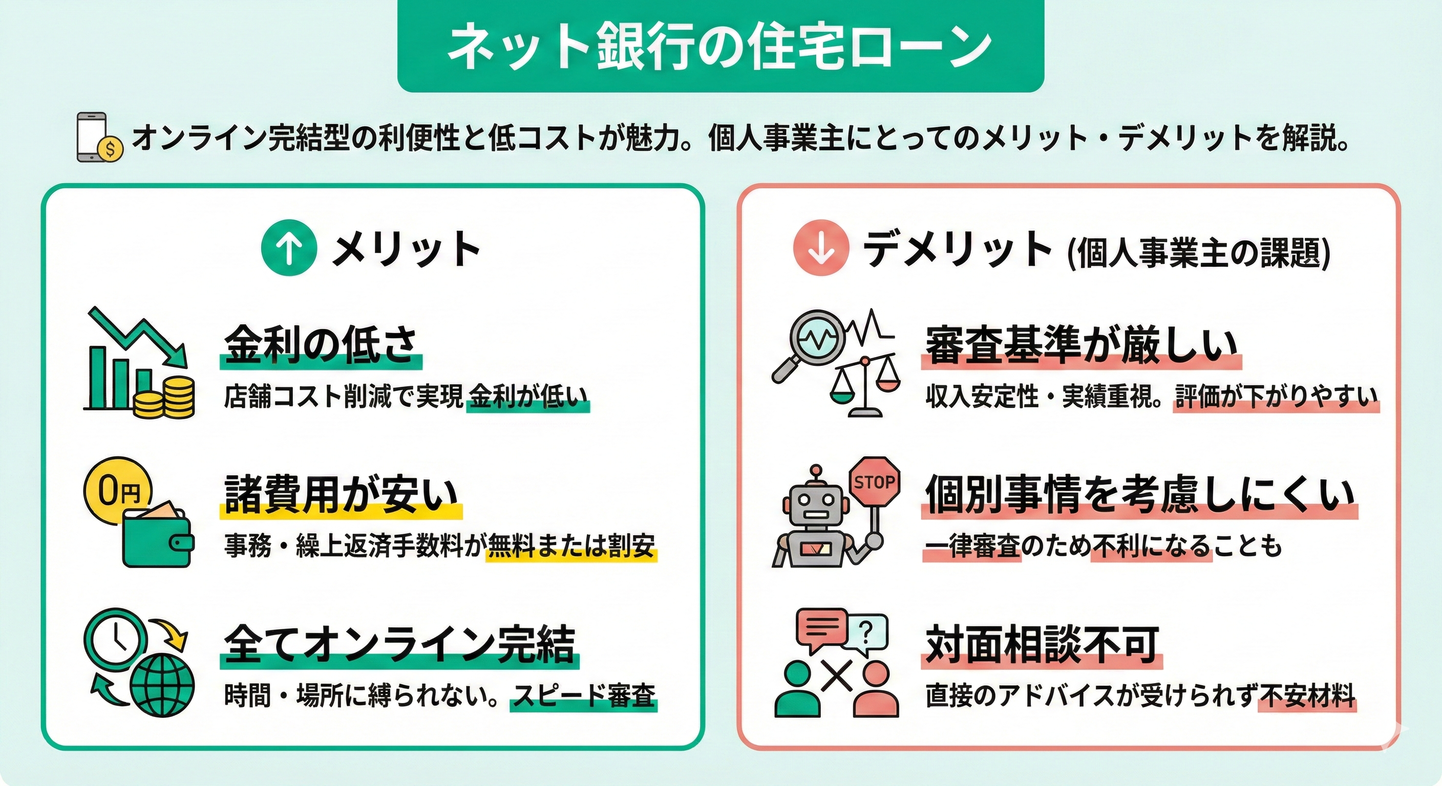 ご自身の事業スタイルや希望条件に合った金融機関を選ぶためにも、それぞれの特徴を比較しておくことは重要です。ここでは、ネット銀行・メガバンク・地方銀行/信用金庫それぞれのメリットとデメリットを整理しながら、個人事業主が注目すべきポイントを解説します。