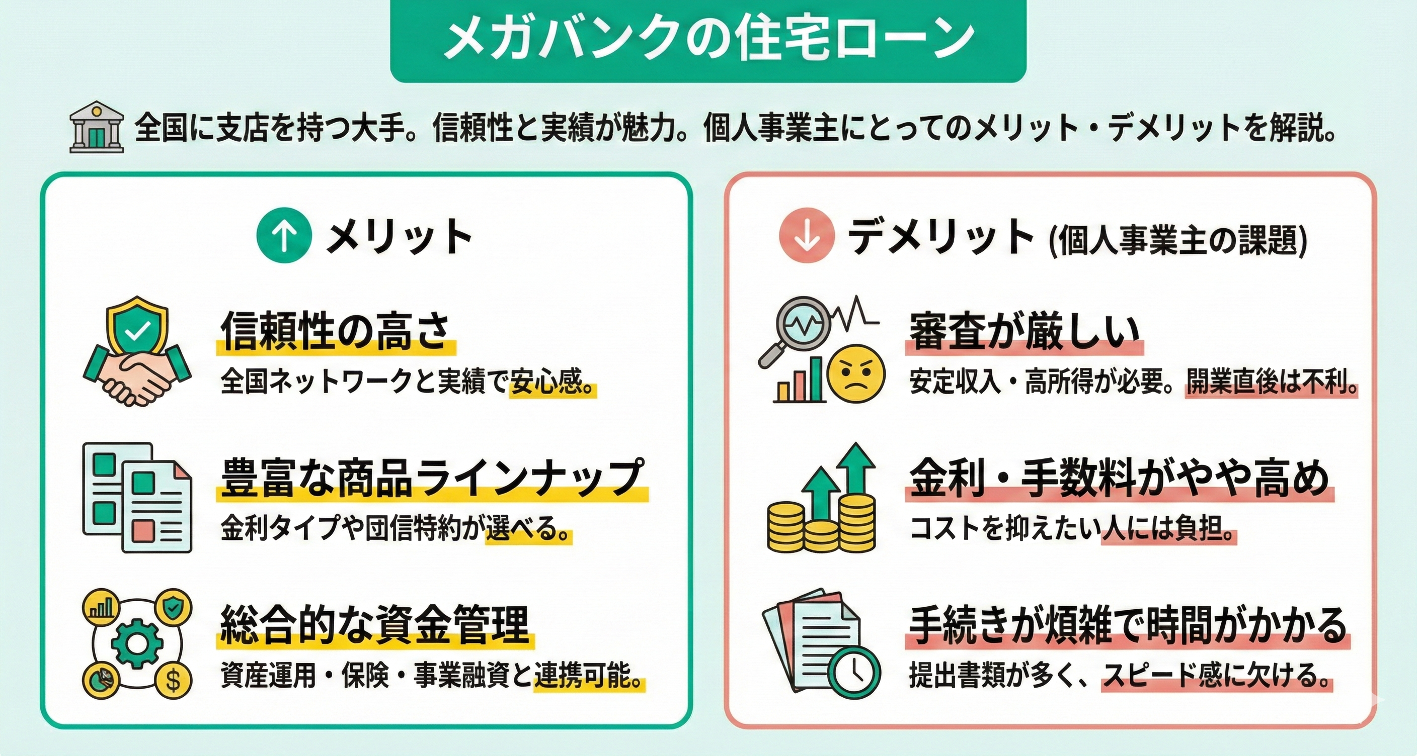 たとえば、メガバンクは資金力があり安心感はあるものの、収入や勤続年数などに関する基準が厳しく設定されている傾向があります。年収の変動や確定申告書の内容に対しても、定型的な評価を行う場合が多く、個人事業主にはややハードルが高く感じられることもあるでしょう。