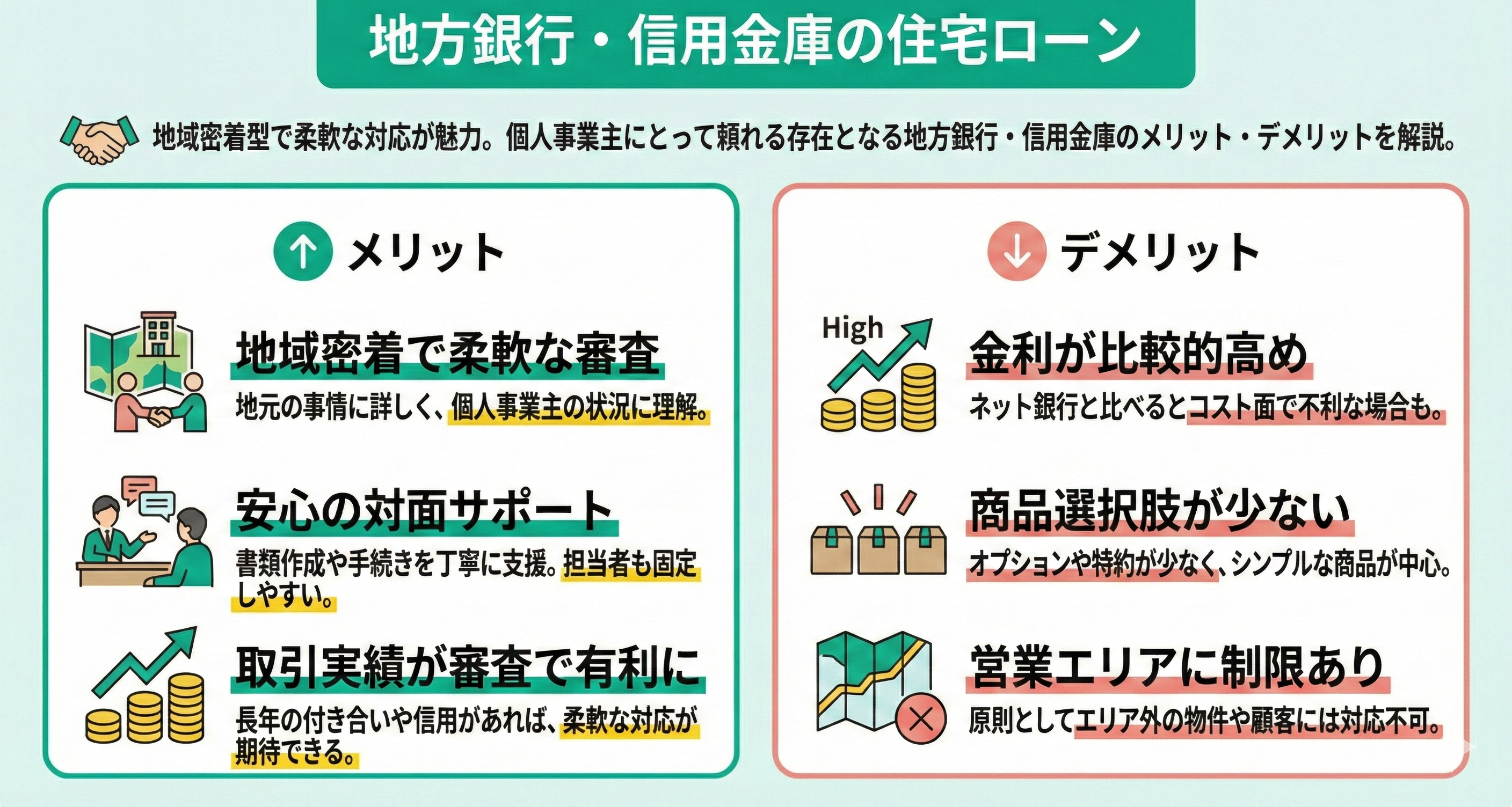 地方銀行や信用金庫の大きな魅力は、地域に根ざした柔軟な対応力です。地元の経済や事業環境に詳しく、個人事業主の不安定な収入や業種特性にも理解を示してくれます。