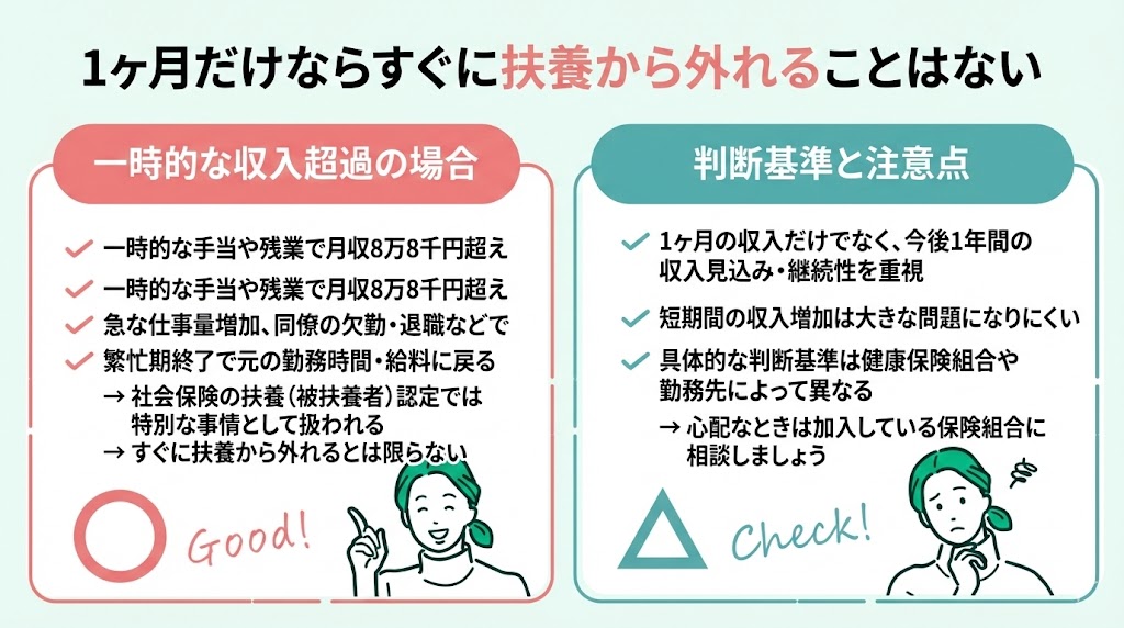 扶養の認定では、1ヶ月の収入だけでなく、今後1年間の収入見込みや継続性が重視されるため、短期間の収入増加は大きな問題になりにくいことが多いです。