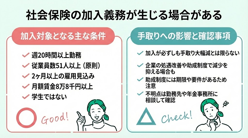 どちらも保険料負担が発生する可能性があるため、手取りと保障のバランスを見ながら、勤務時間や収入見込みを踏まえて働き方を調整するか、加入を前提に働き方を見直すか検討しましょう。
