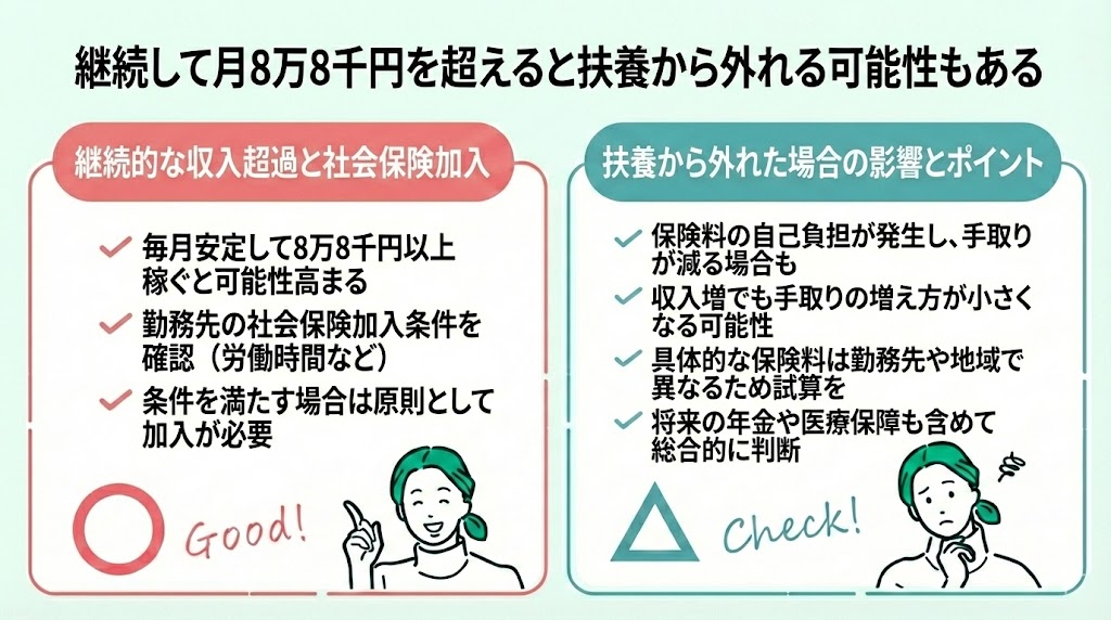 - 継続して月8万8千円を超えると扶養から外れる可能性もある