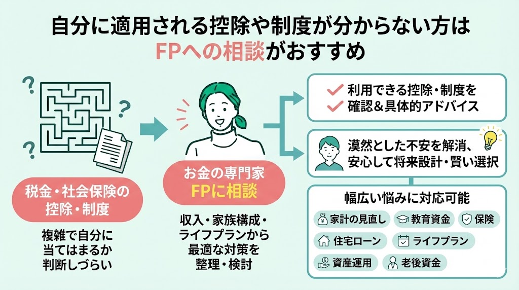 - 自分に適用される控除や制度が分からない方はFPへの相談がおすすめ