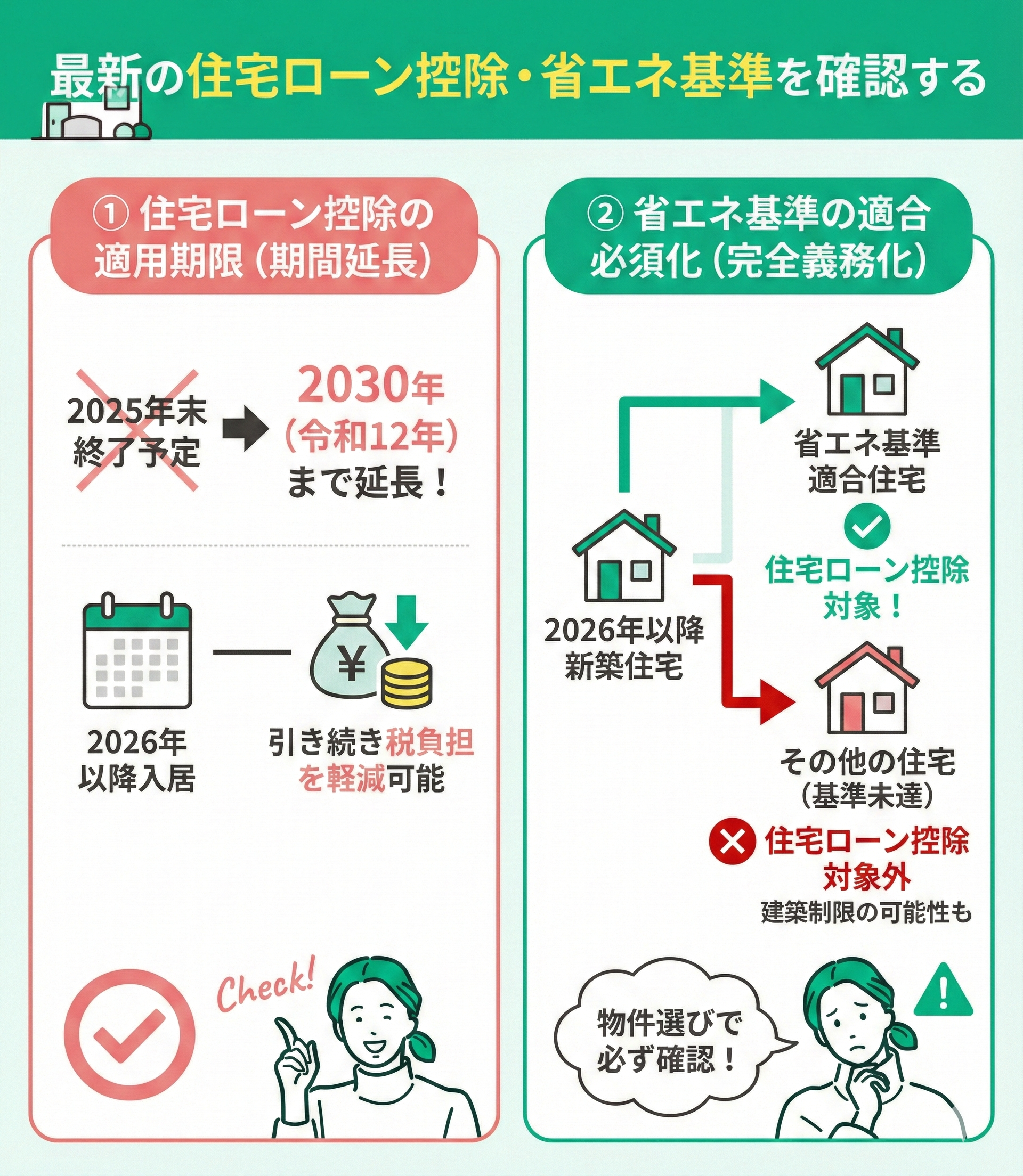 2026年時点の最新制度において、資金計画や物件選びに大きく関わる変更点があります。以下の2点は必ず確認しておきましょう。