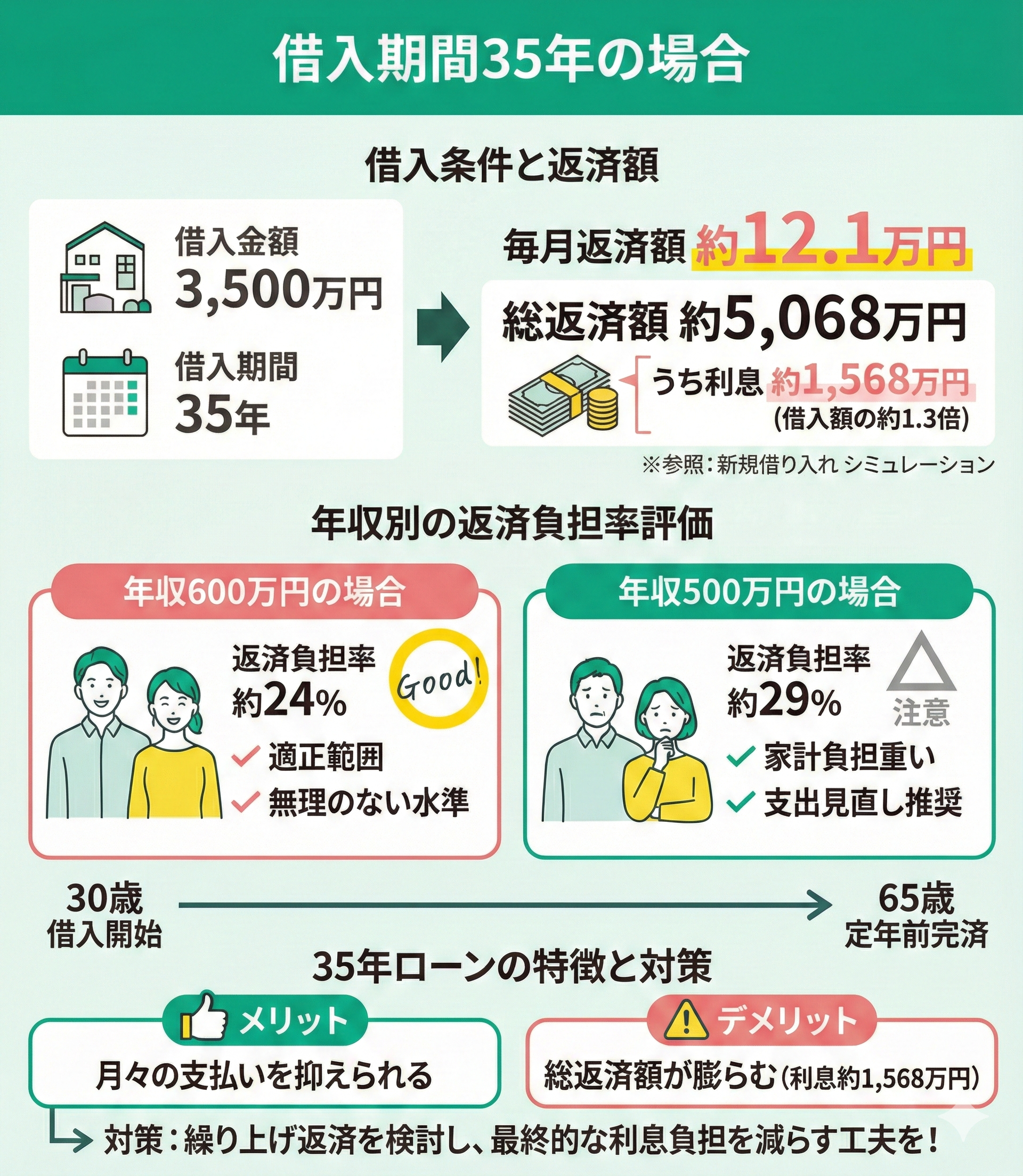 35年ローンは月々の支払いを抑えられる反面、総返済額は約5,068万円(利息約1,568万円)まで膨らむ点に注意が必要です。