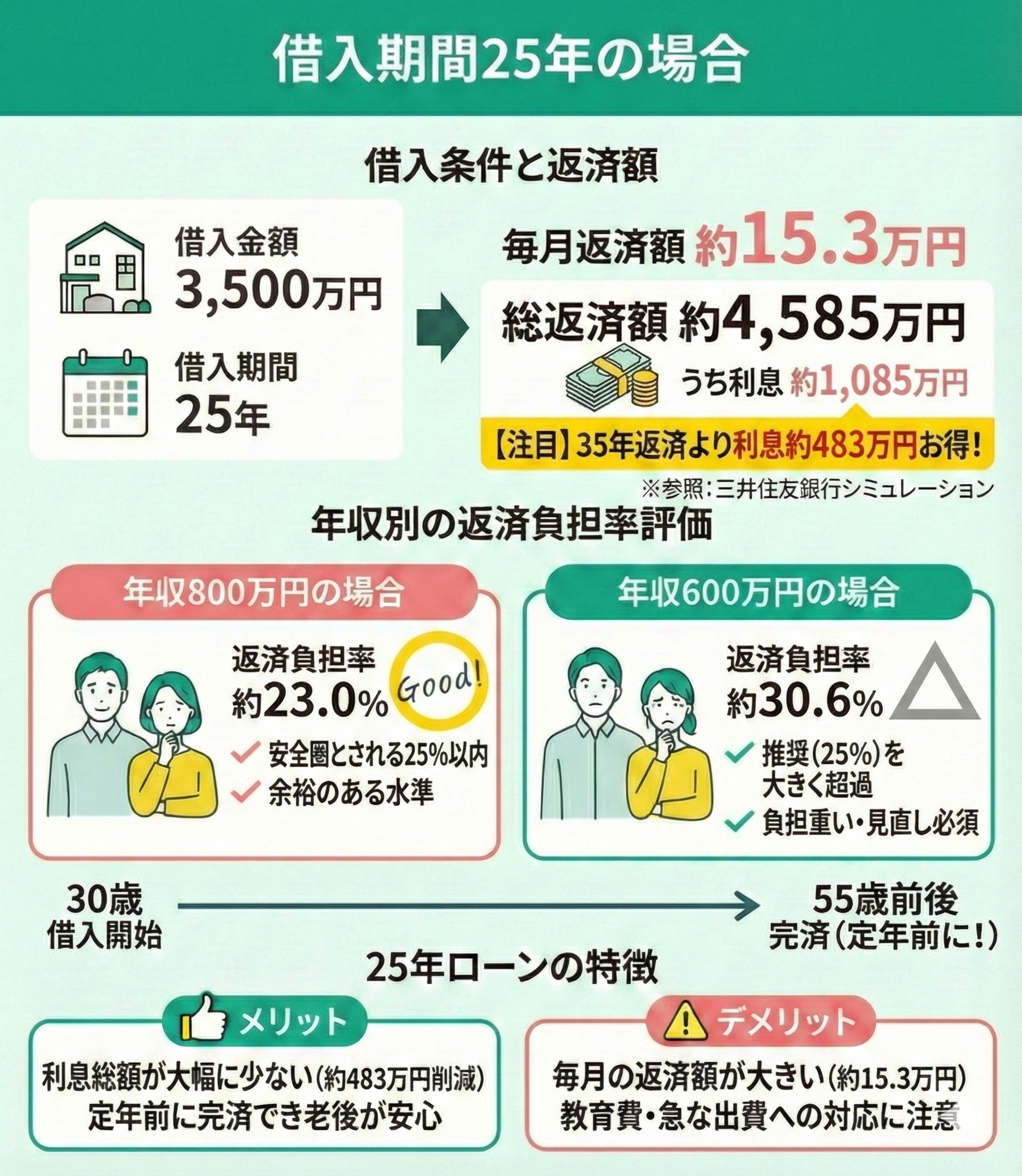 55歳で完済できる大きなメリットがありますが、毎月の支払いが重いため、教育費等が重なる時期の収支シミュレーションが不可欠です。