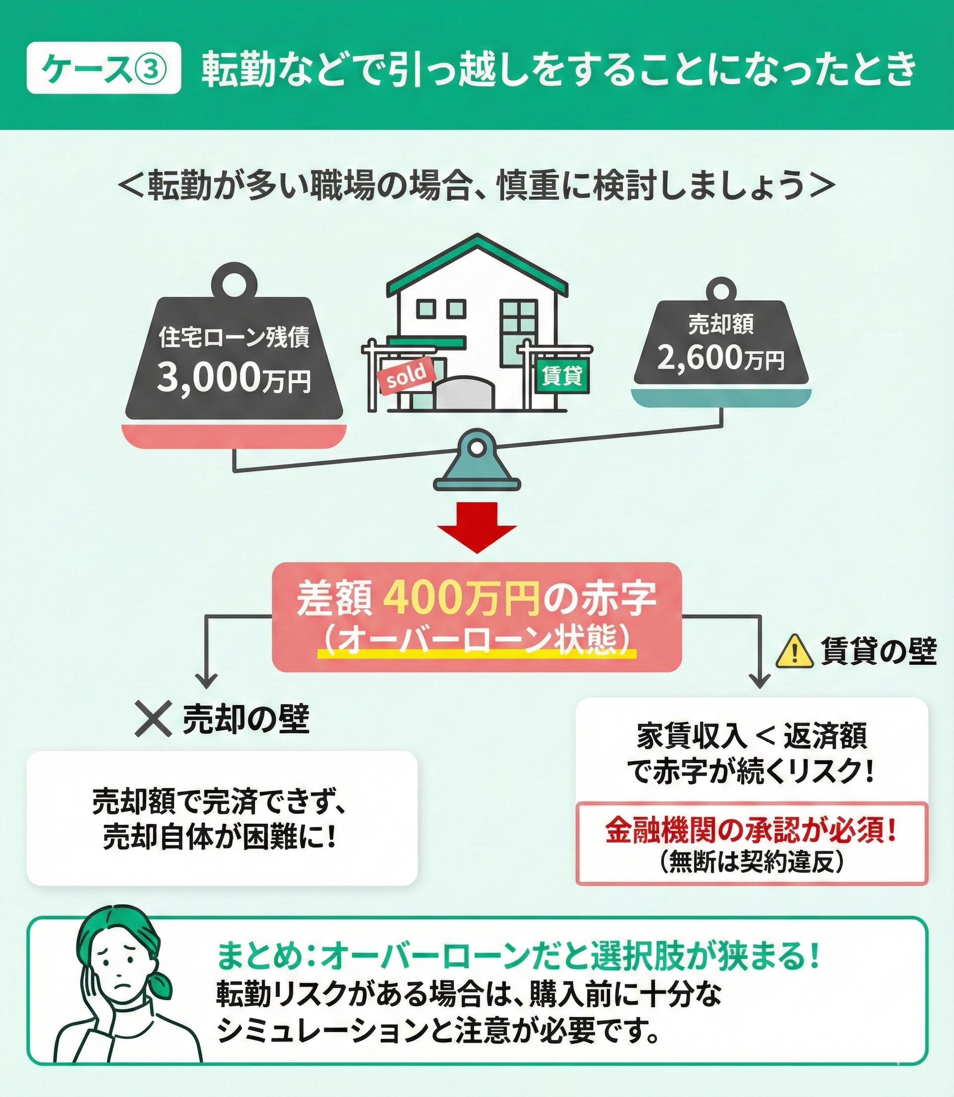 転勤や親の介護、子どもの進学などで引っ越しを余儀なくされた場合、売却や賃貸に出すことも考えられます。しかし、オーバーローン状態だと売却も賃貸化も難しい状況となり、選択肢が狭まる可能性があるのです。
