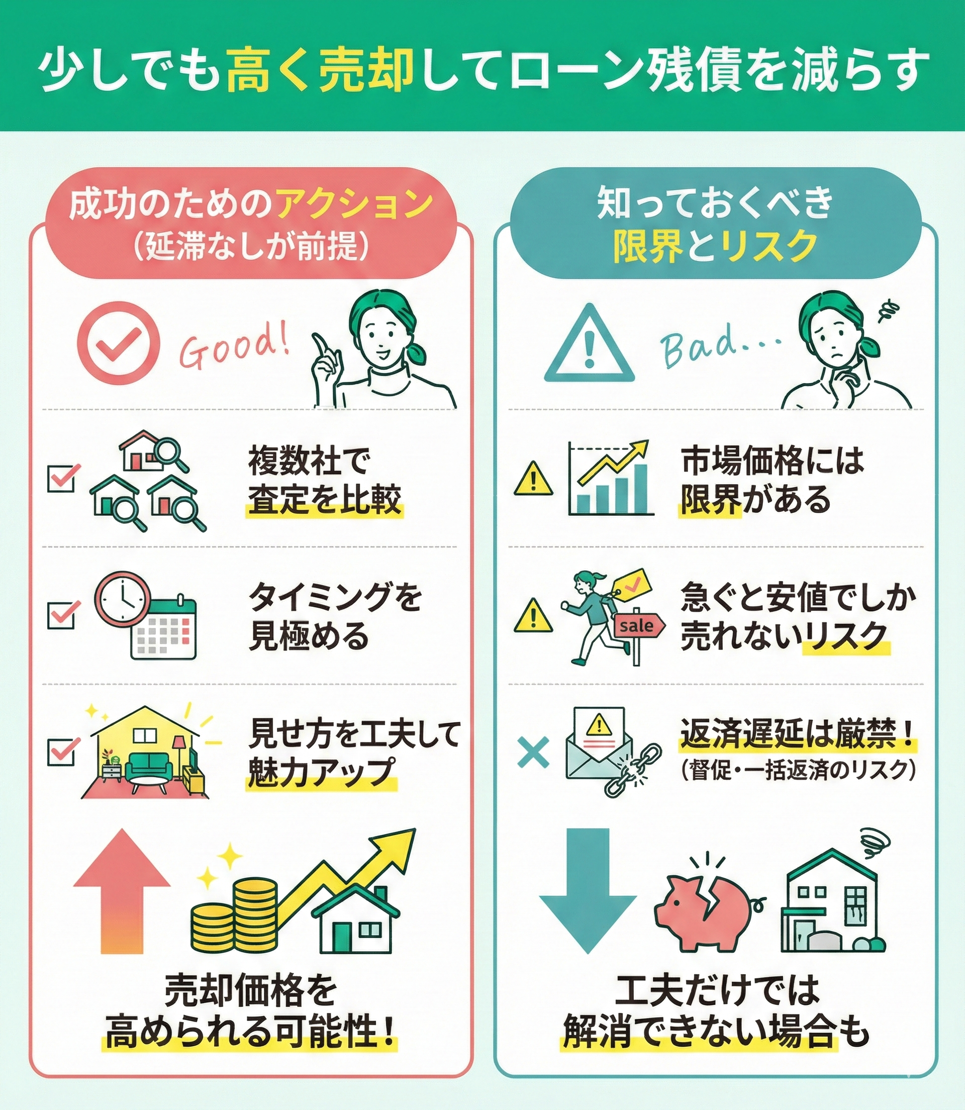 オーバーローンを解消するためには、少しでも高く売却することが必要です。ローンの支払いが困難になっても、返済金が延滞なく支払えていれば工夫次第で売却価格を高められる可能性があります。