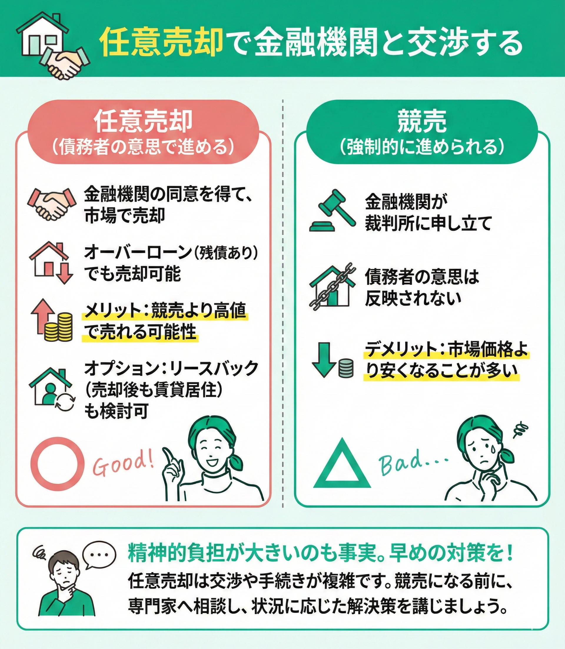 任意売却とは、住宅ローンの返済が困難になった場合に、金融機関(債権者)の同意を得て、競売になる前に物件を売却する方法です。