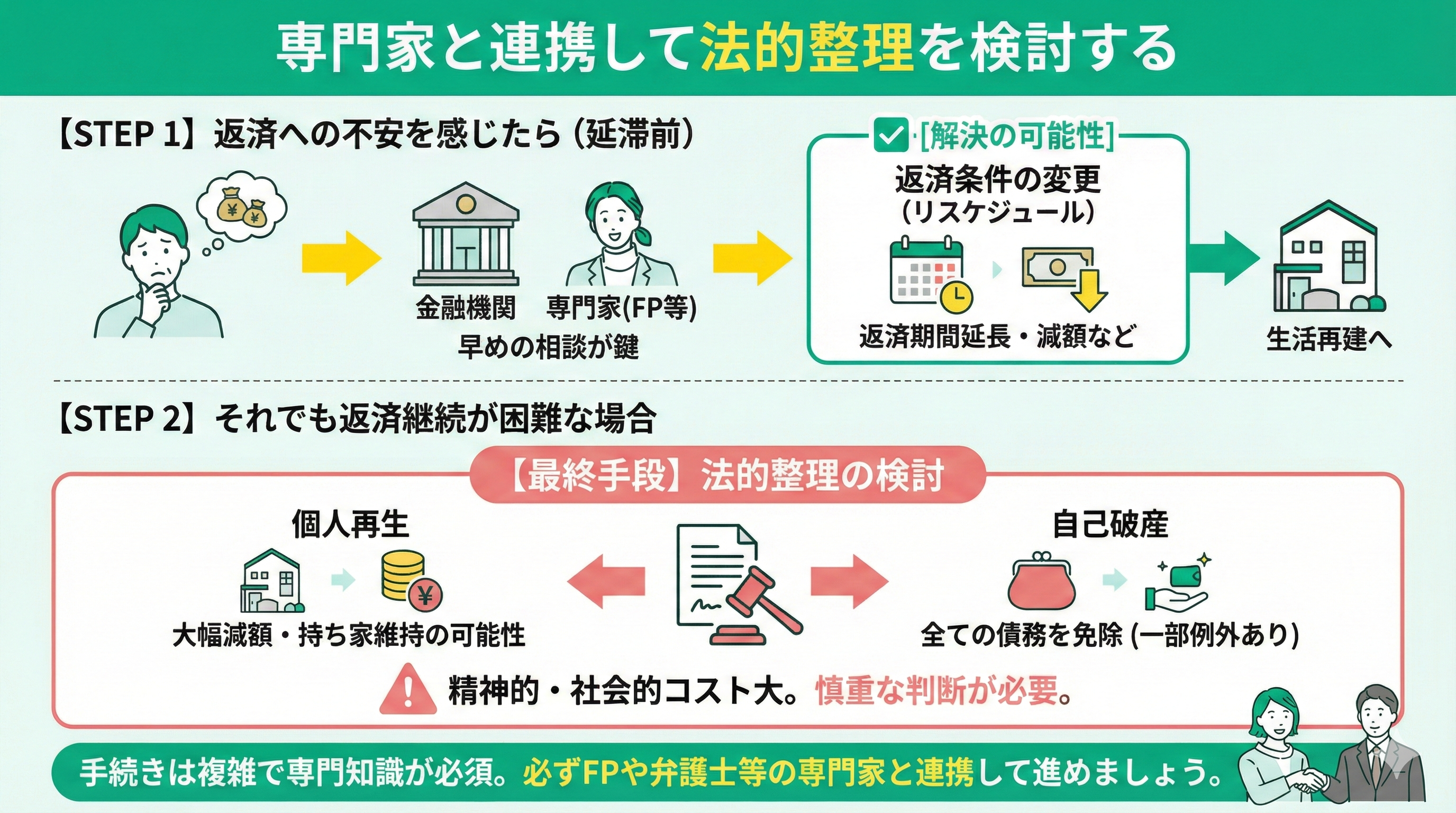 法的手段は最終手段です。生活再建の道筋はあるものの、精神的・社会的コストは非常に高くなるので、慎重に検討しましょう。また、これらの手続きは専門的な知識を要するためFPなどの専門家と共に進めると安心です。