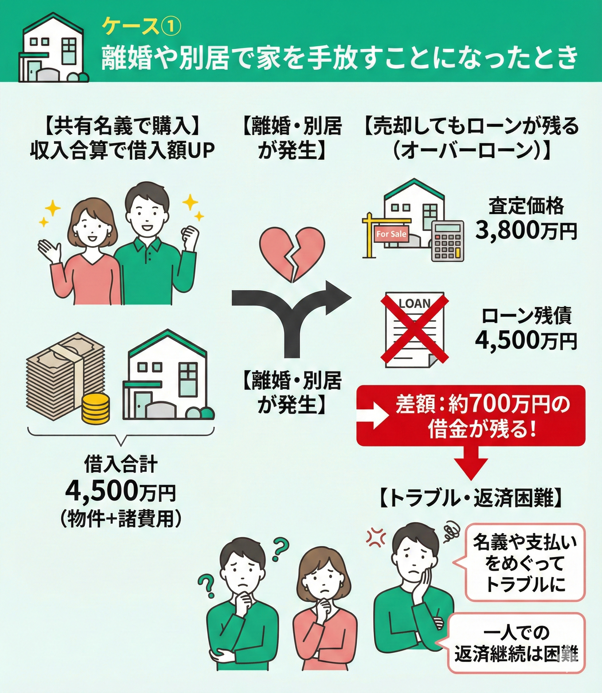 しかし、後に深刻な問題になることもあります。たとえば、物件価格は4,000万円、諸費用や家具代の500万円を上乗せし、夫婦で合計4,500万円を借入しました。離婚後に売却を試みたが、住宅の査定価格は3,800万円。売っても700万円近くのローンが残ってしまい、名義や支払いをめぐってトラブルになったというケースもあります。