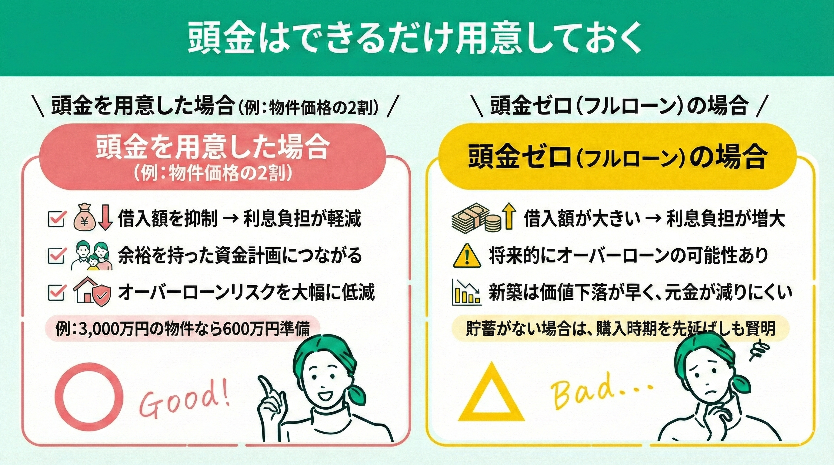 頭金がゼロでも購入できる物件は、一見魅力があるように見えますが、借入額が大きくなるため、長期目線で考えるとリスクが高い選択です。