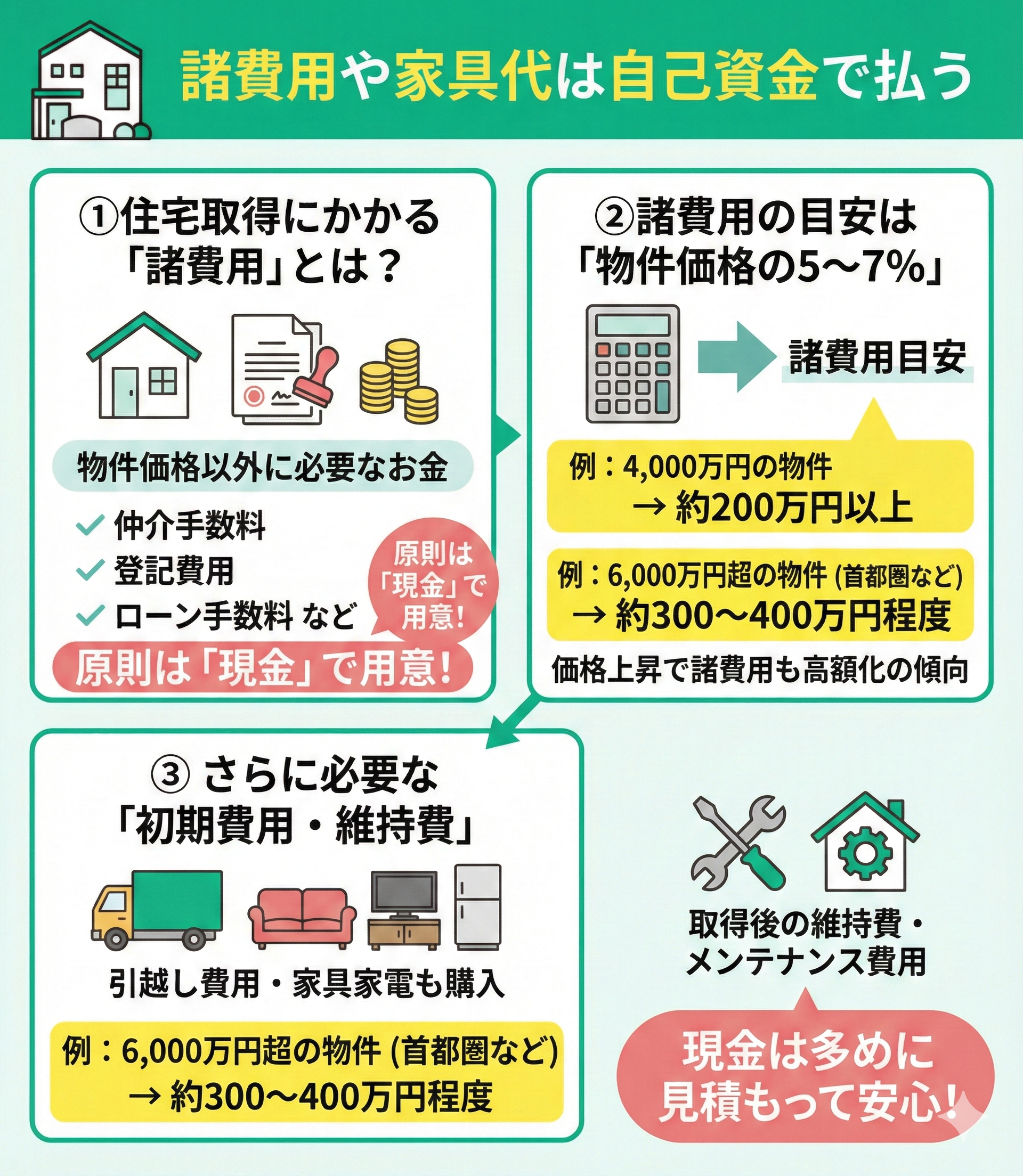 近年は資材高騰などで物件価格自体が上昇傾向にあります。4,000万円の物件であれば200万円以上、首都圏などで6,000万円を超える物件であれば300〜400万円程度の諸費用が現金で必要になることも珍しくありません。