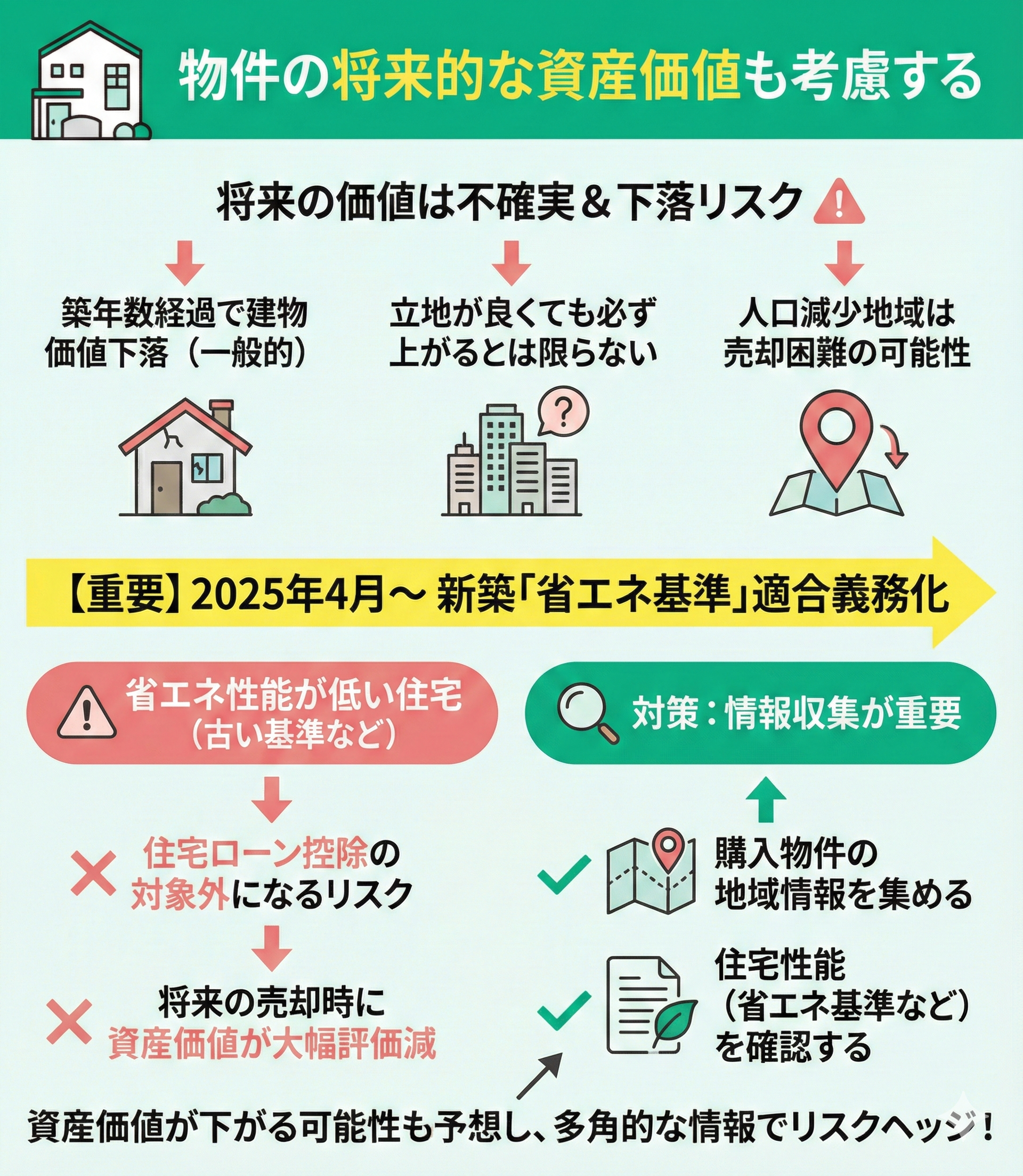 今後は省エネ性能が高い住宅がより優遇されるため、基準を満たさない住宅は新築・中古問わず需要が減り、将来的な資産価値が大きく評価減されるリスクがあります。