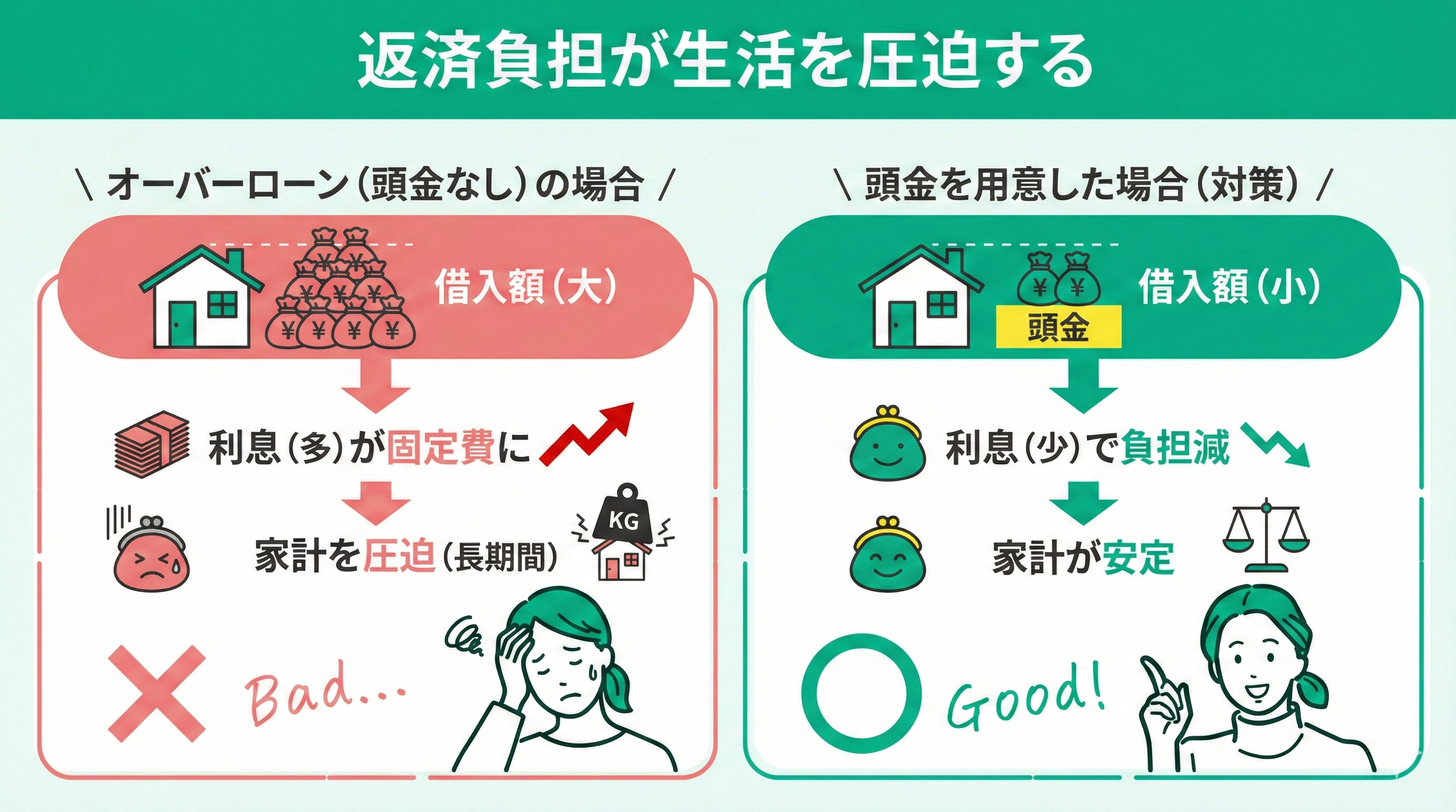 「なんとかなる」という曖昧なイメージでローンを借りると、思っていた以上に生活を圧迫します。特に住宅価格を超える借入を行うオーバーローンでは、借入額が多い分だけ支払う利息も多いです。増えた利息分だけ固定費として、家計にのしかかります。