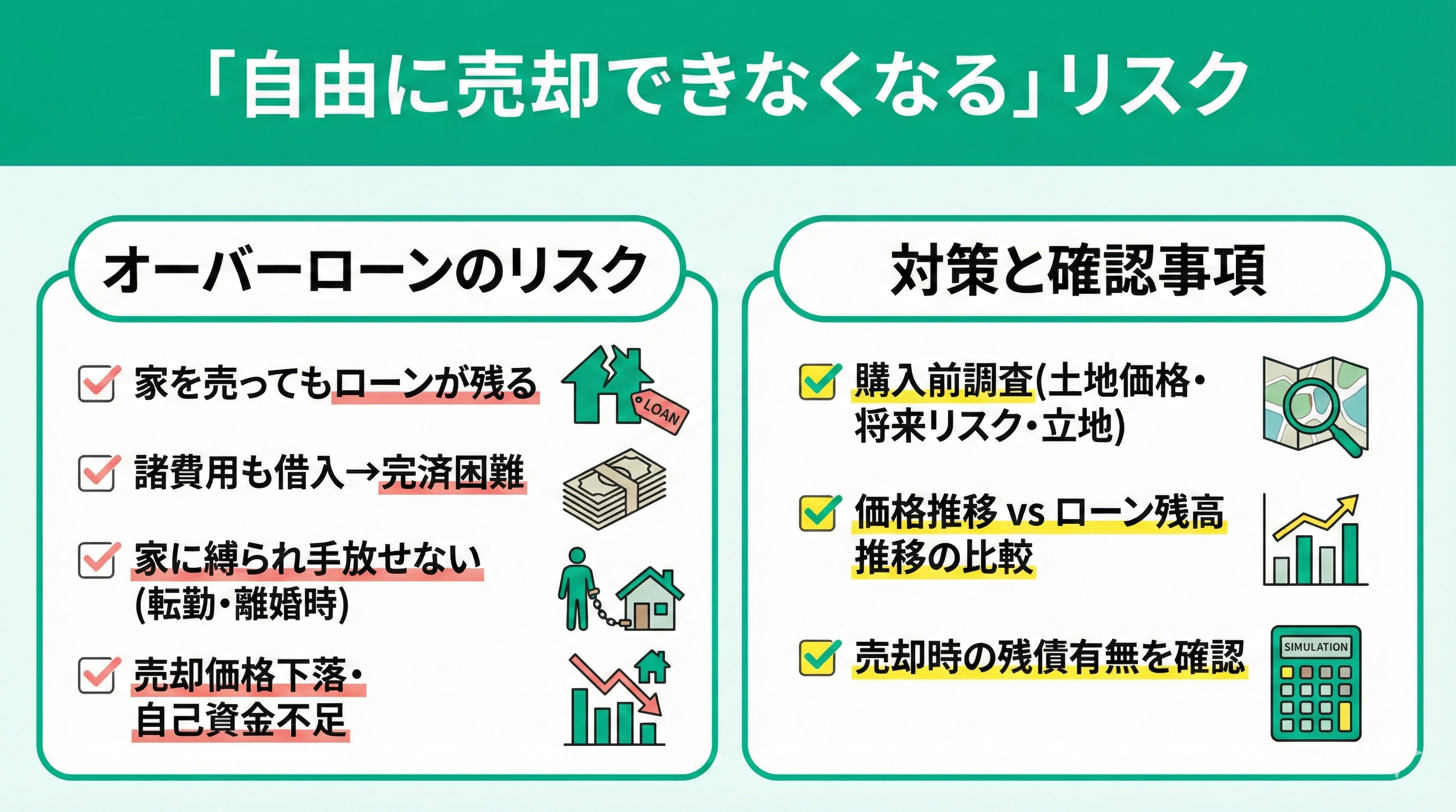 オーバーローンのリスクは、家を売ってもローンが残る可能性があることです。住宅購入に関する諸費用分も借りるので、家を売却しても完済できない場合があります。ローンが残れば、その分を返済しなければなりません。