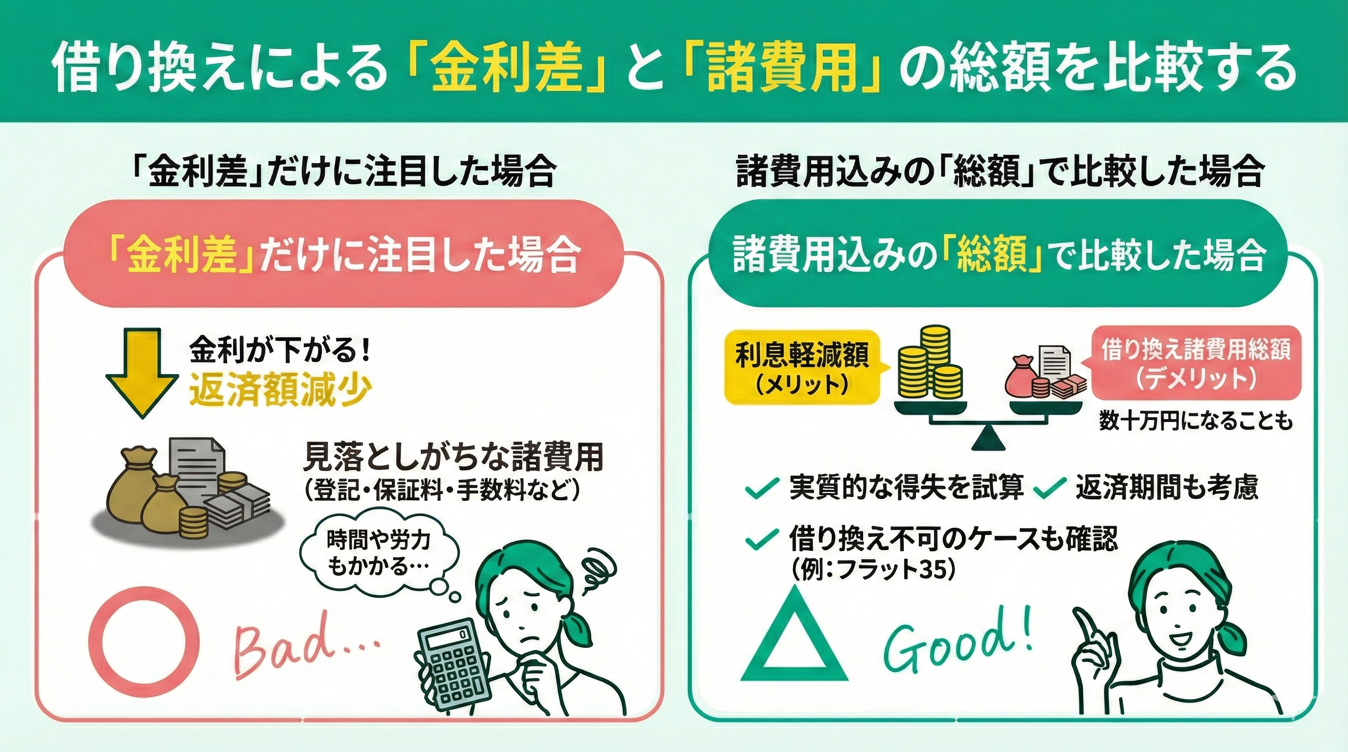 特に「フラット35から借り換えできない(銀行)」といった事例もあるため、事前に費用対効果を冷静に見極めることが重要です。