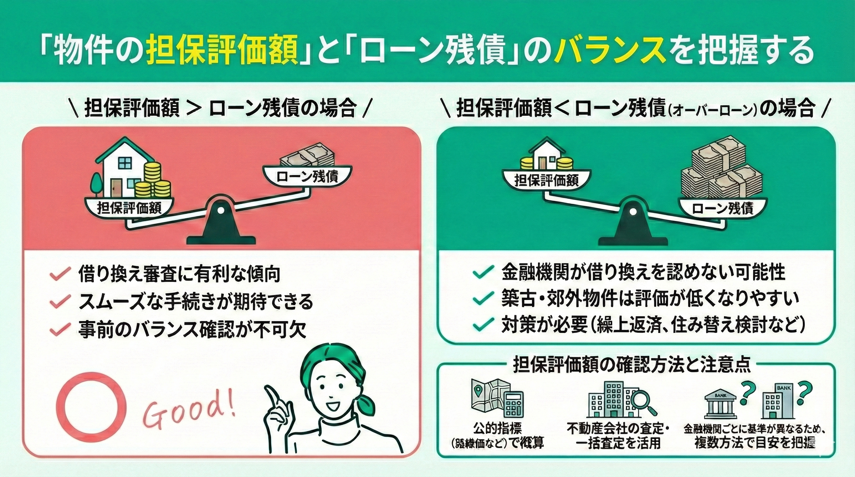 - 「物件の担保評価額」と「ローン残債」のバランスを把握する