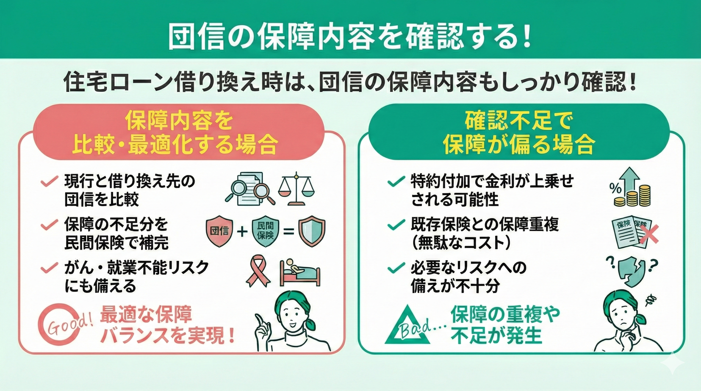 特に、がんや就業不能などのリスクに備えるには、団信だけでなく、民間保険との組み合わせも視野に入れるべきです。