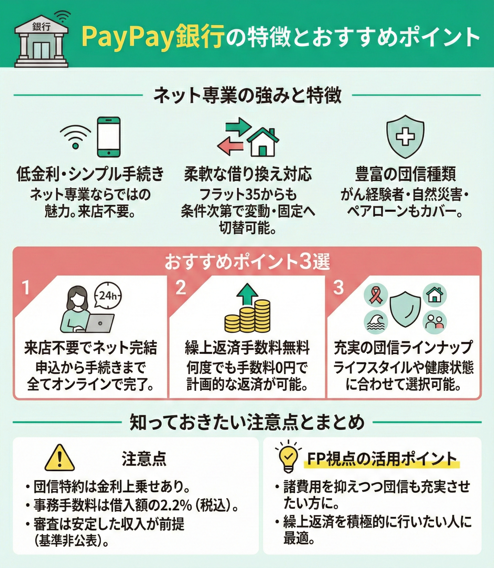 PayPay銀行は、ネット専業ならではの低金利とシンプルな手続きが魅力です。フラット35から借り換えできない場合でも、条件を満たせば変動金利型や固定金利選択型への乗り換えが可能です。