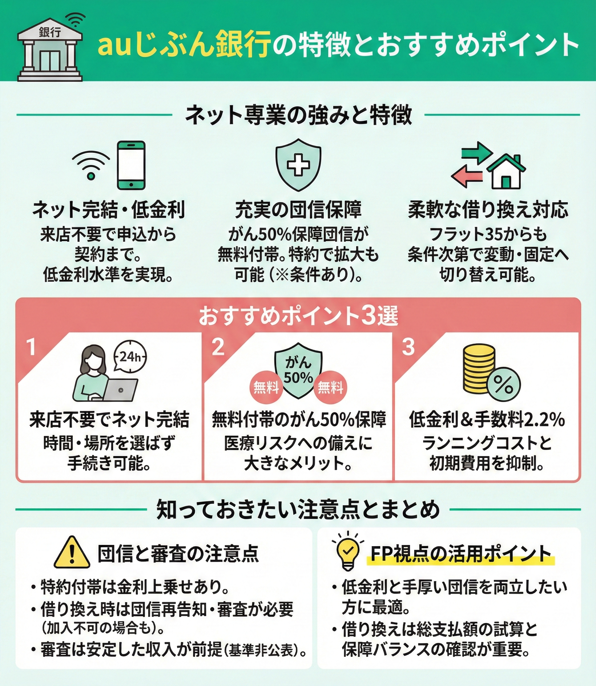 auじぶん銀行は、ネット専業ならではの低金利と充実した団信保障が特徴です。フラット35から借り換えできないケースでも、審査条件を満たせば変動金利型や固定金利選択型への切り替えが可能です。