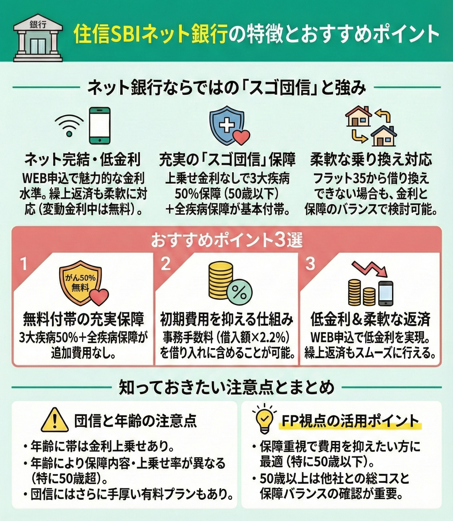 住信SBIネット銀行は、「スゴ団信」によって充実した保障が基本付帯されるネット銀行ならではの利点があります。フラット35から借り換えできない場合でも、金利と保障のバランスから乗り換え先として検討可能です。