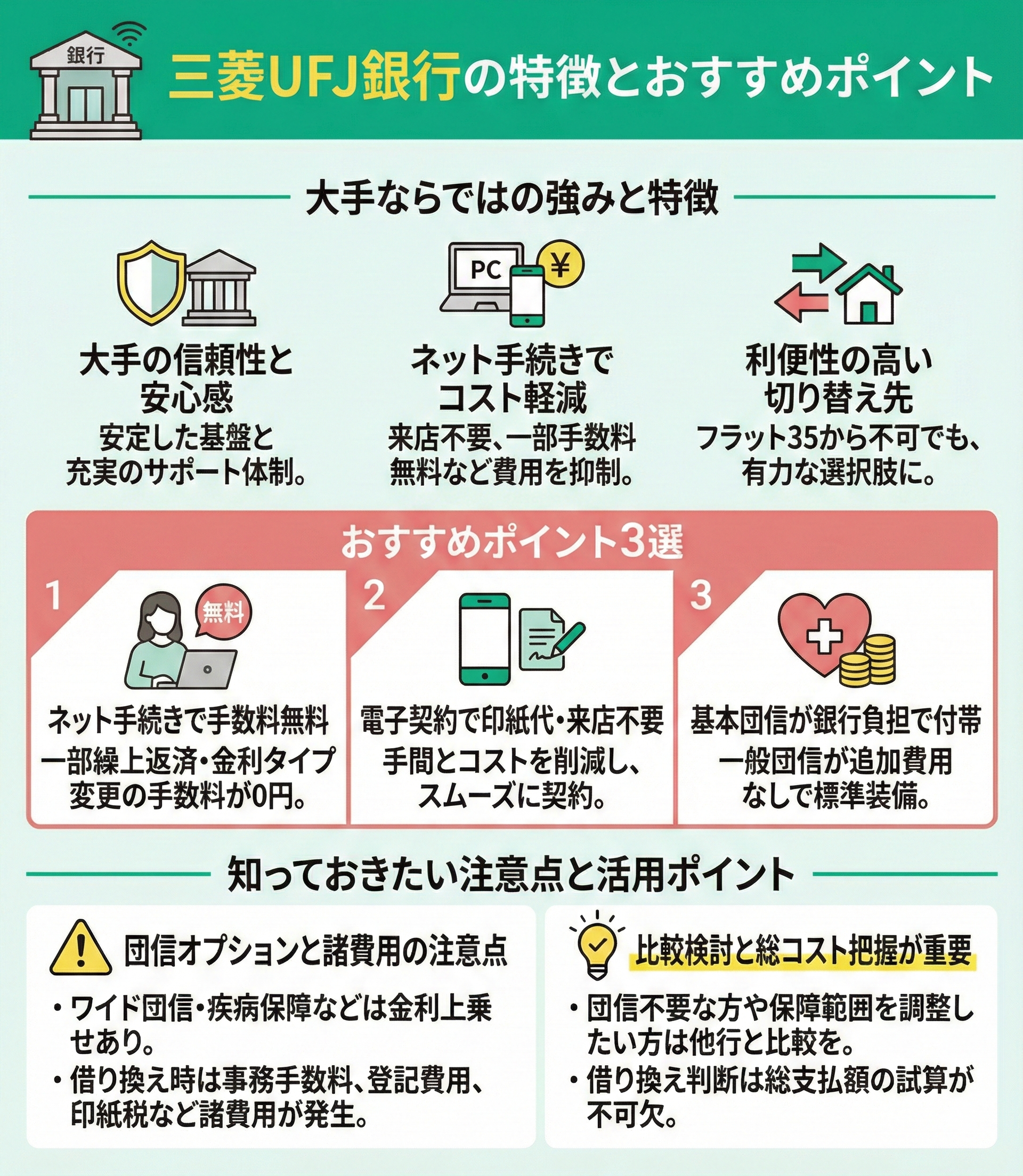三菱UFJ銀行は、大手ならではの信頼性とネット手続き時のコスト軽減が魅力です。フラット35から借り換えできない場合でも、利便性の高い切り替え先として検討に値します。