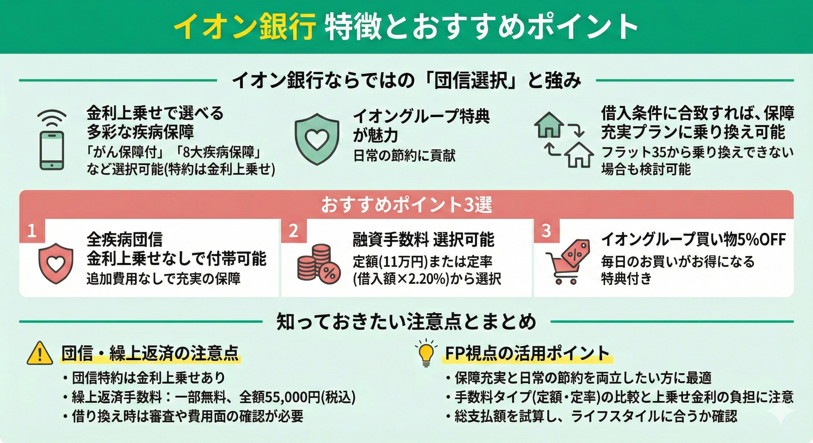 イオン銀行は、多彩な疾病保障を金利上乗せで選べる点とイオングループ特典が魅力です。フラット35から借り換えできない場合でも、借入条件に合致すれば、保障充実のプランに乗り換え可能です。