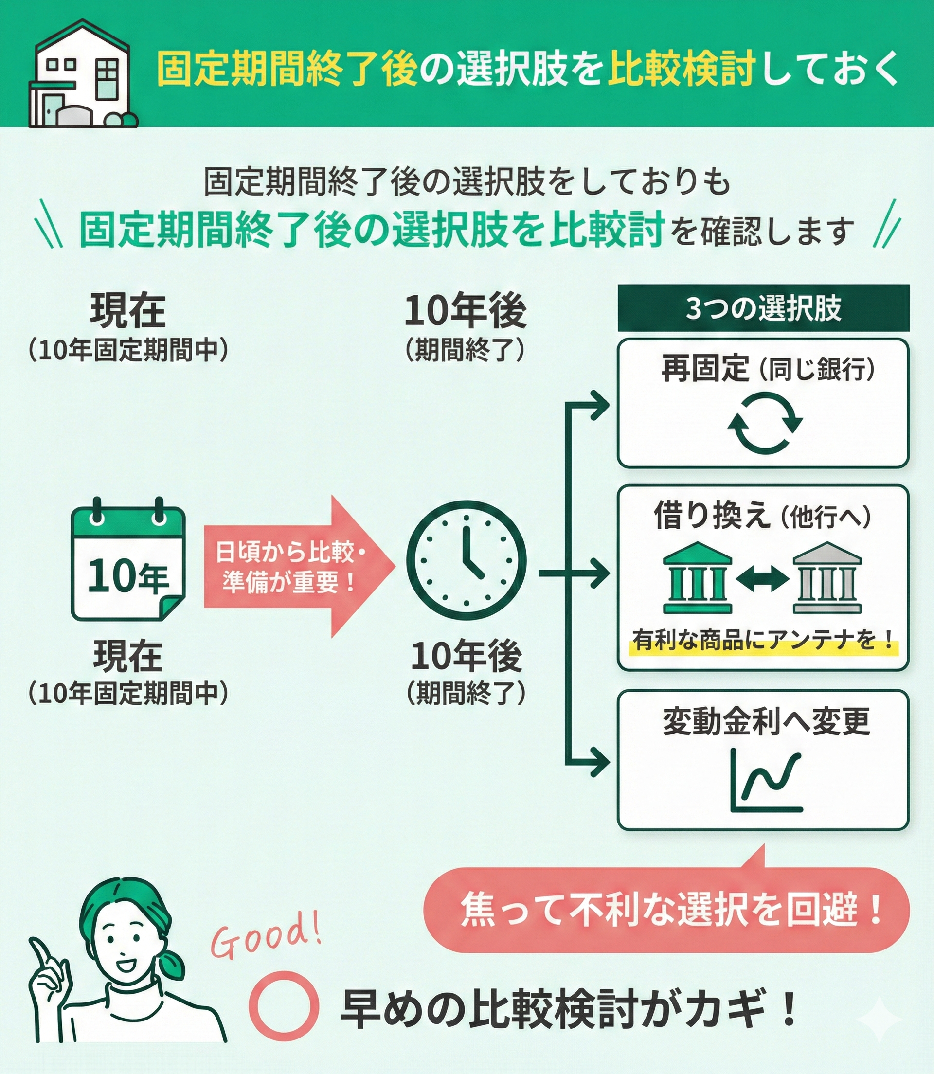 10年後の金利タイプが切り替わるタイミングで焦って不利な選択を取らないよう、「再固定・借り換え・変動金利」どれが良いかを、日頃から比較しておきましょう。